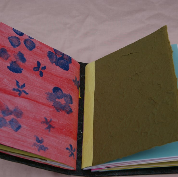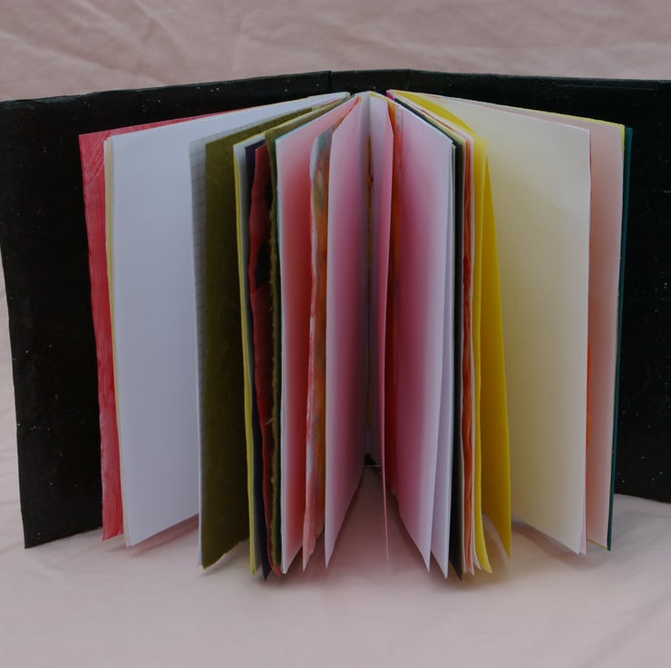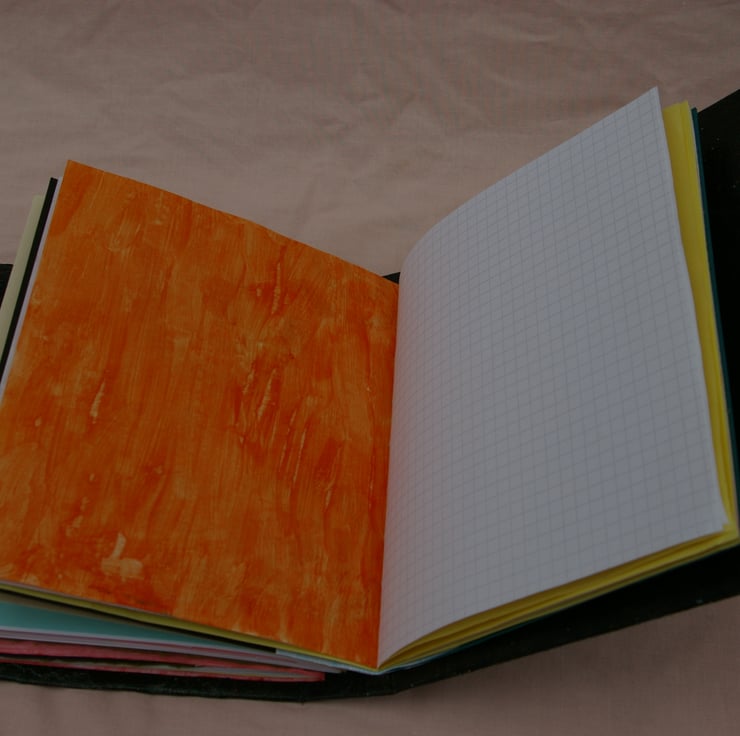 There are three signatures within the book each one containing different pages of new and upcylced paper. I have used plain white, coloured, graph, painted, paper along with colour card and handmade textured paper. There is plenty of room for writing, for adding embellishments and keepsakes. The signatures are hand sewn to the spine of the book in yellow embroidery thread