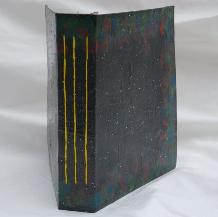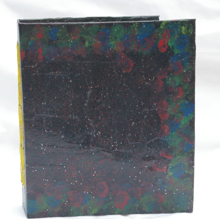 A handmade paper mache large Hard Back Note book or small journal created from new and upcycled paper and card. This lovely note book or journal’s cover has been hand painted in a black paint that contains red, green, and silver glitter that give is a wonderful sparkle. All around the edge of the cover I have painted a representation of a field of mixed red poppies and blue cornflowers. I have painted the inside cover with the same black and glitter paint as the outside cover.