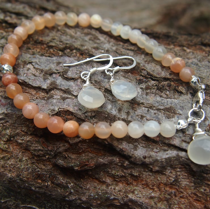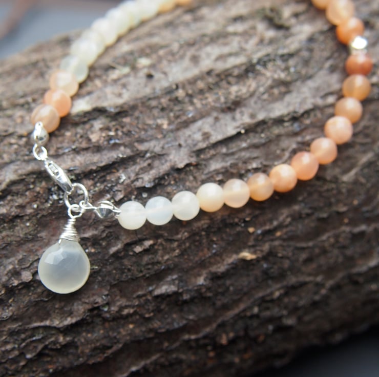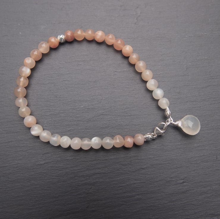 Simple, pretty bracelet of peach and creamy-white round moonstones, with a sterling silver accent bead and clasp, and a creamy moonstone pear-shaped "briolette" pendant at the clasp.