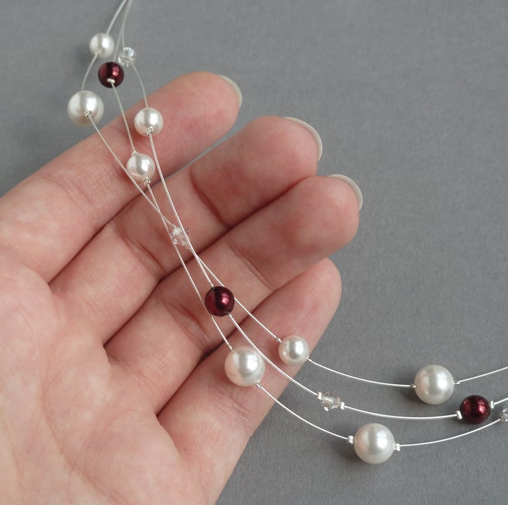 This white and claret floating pearl necklace has been created using white glass pearls, burgundy Czech glass pearls and sparkling crystals. This multi-strand necklace would make an elegant accessory for a bride or bridesmaid in a deep red themed wedding.