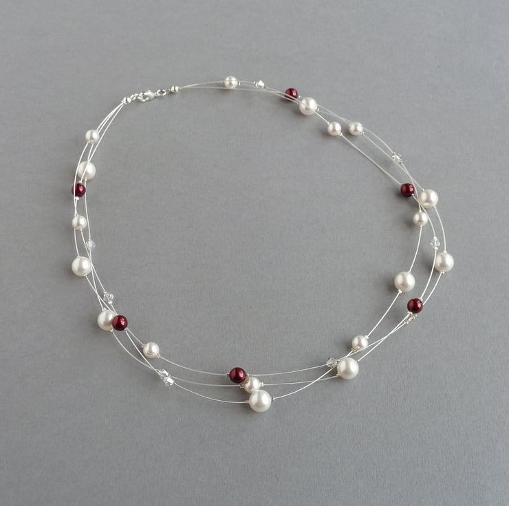 This white and claret floating pearl necklace has been created using white glass pearls, burgundy Czech glass pearls and sparkling crystals. This multi-strand necklace would make an elegant accessory for a bride or bridesmaid in a deep red themed wedding.