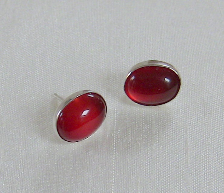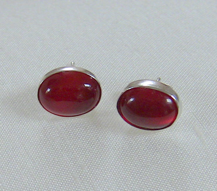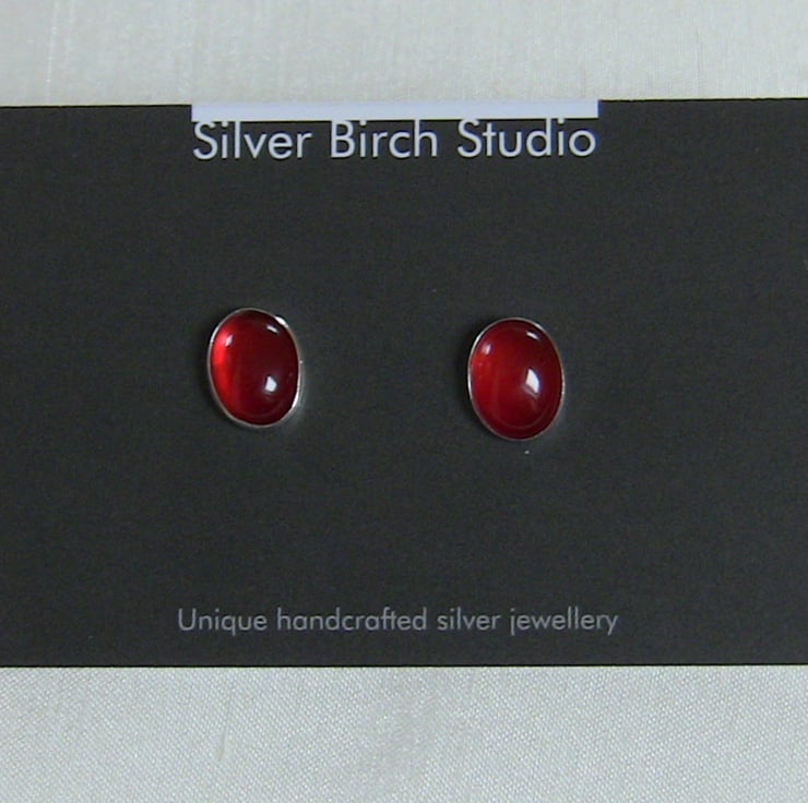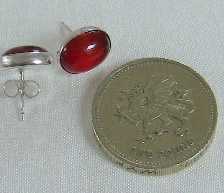 These gorgeous earrings feature oval cabochons of carnelian - a variety of chalcedony coloured by traces of iron oxide. It was widely used in Greek and Roman times to make seal rings, for imprinting on wax. Carnelian is a July birthstone. These stones are a lovely strawberry red colour that reminds me of Rowntree's Fruit Gums! They measure 10x8mm and have been set in sterling silver bezel cups. The posts and scrolls are also of sterling, stamped '925'. I have a matching ring available in my shop, stock number R98 (see last photo).