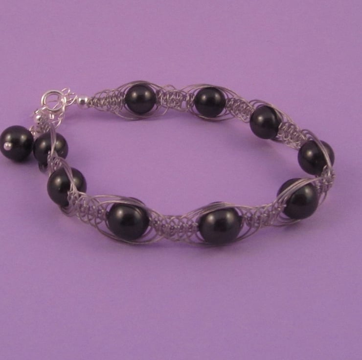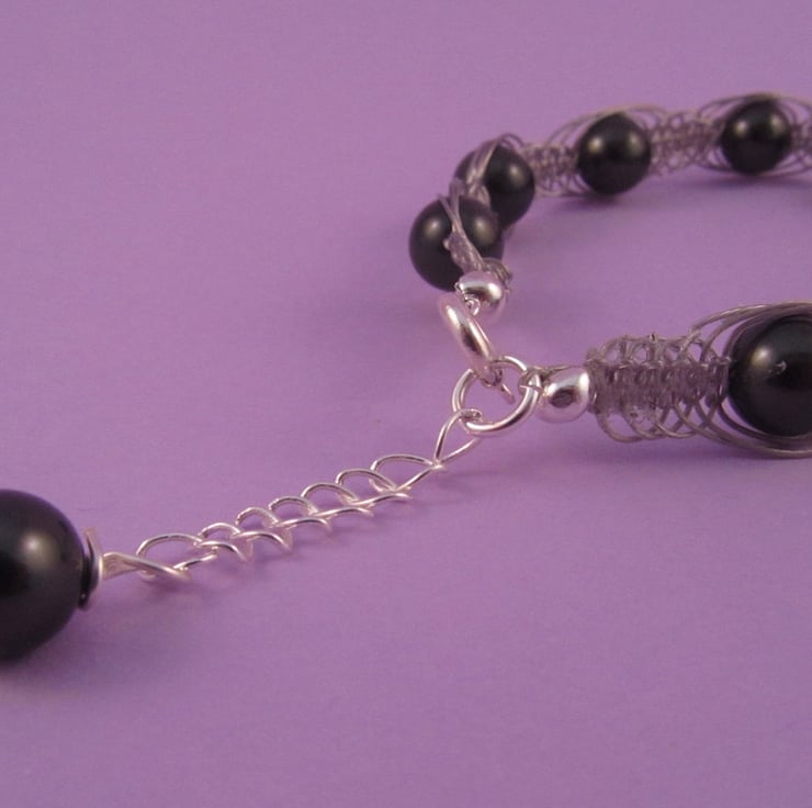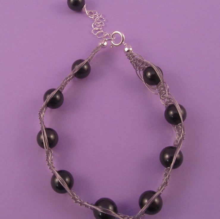 This is a beautiful black shell pearl macramé bracelet. It is created using real black shell pearls, silver plated copper chain, silver plated copper lobster clasp and beading wire. This is one of those pieces that can be worn either as casual or for that special occasion.