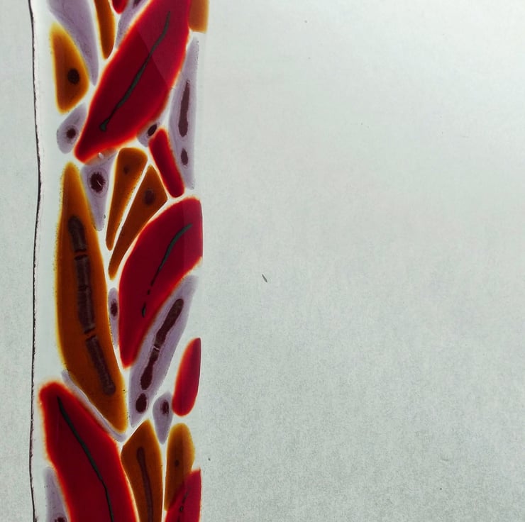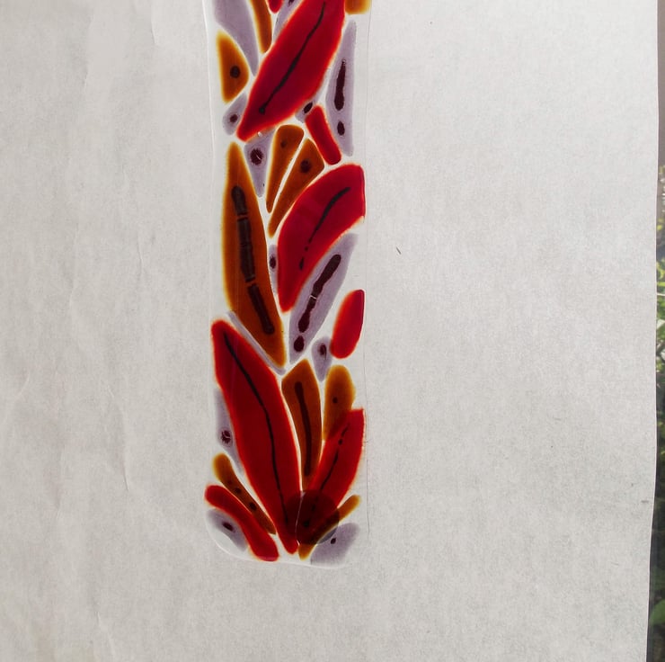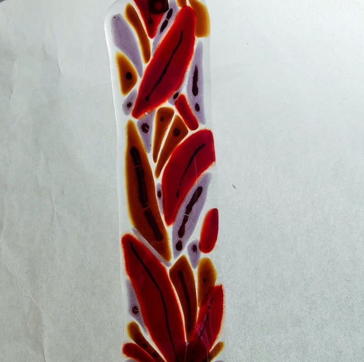 Celebrating Summer foliage with this lovely, vibrant window hanging. A unique piece of art made with mauve, burnt orange, red and grape coloured glass hanging with glass enamel details painted on and then fired in my kiln.
