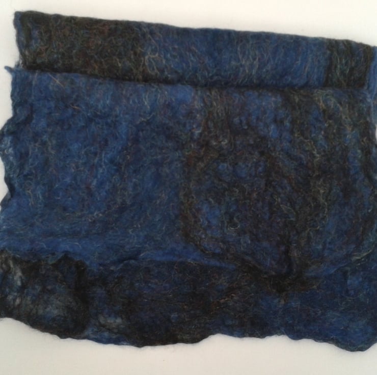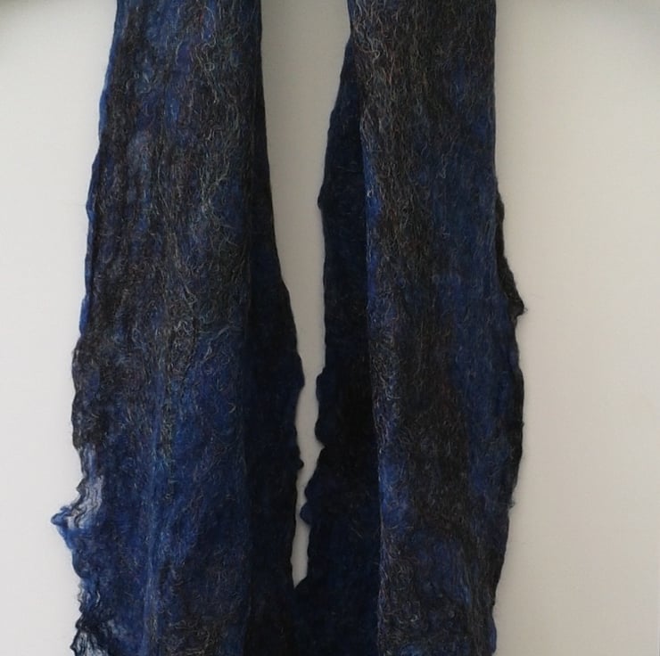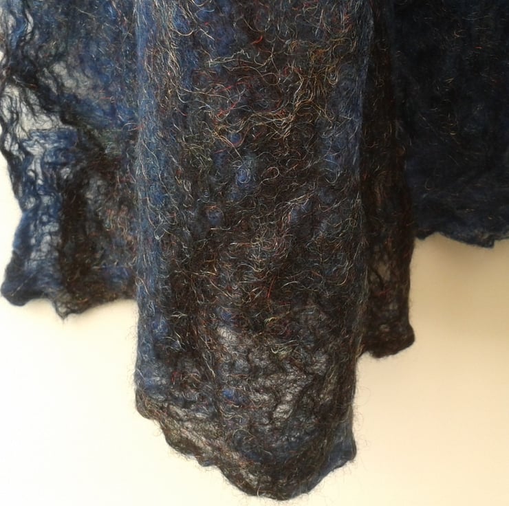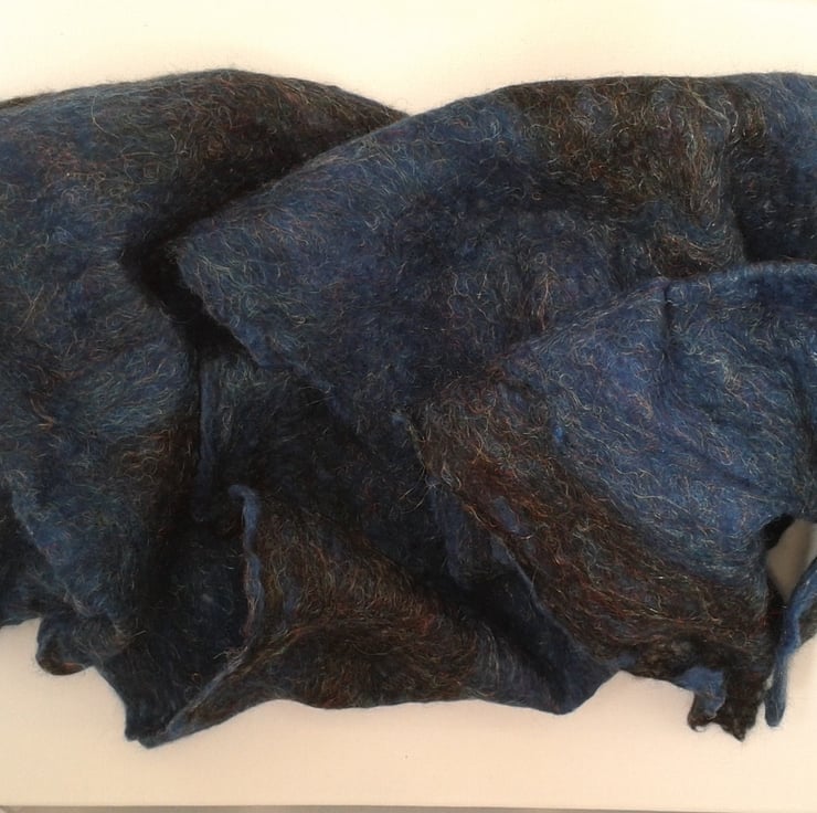 A fabulous blend of merino wool in gorgeous shades of blue and black has been used to make this cobweb felt scarf. The addition of strands of trilobal nylon to the blend gives a lovely glitzy effect. This scarf weighs in at less than 50g and measures approximately 114cm x 26cm. Cobweb felt is a very fine, soft felt and is almost transparent in places. Small holes are characteristic of this material but add rather than detract from its beauty. I have tried to illustrate this in the photographs.