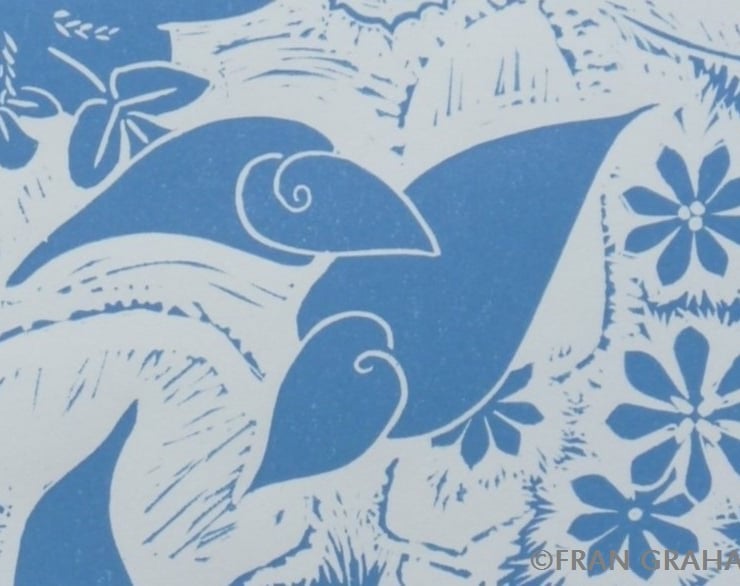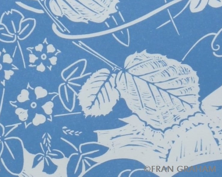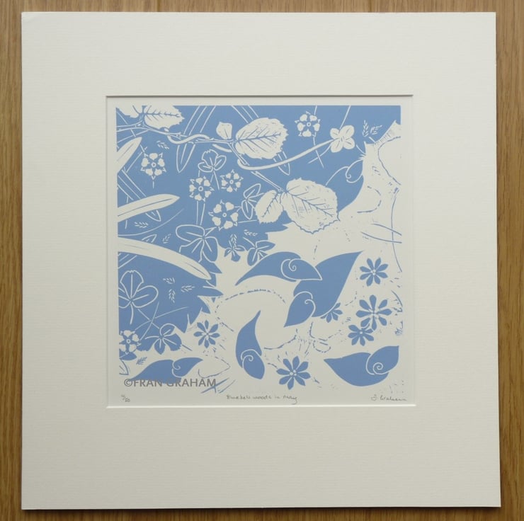 In this original lino print I have stylised Bluebell leaves, Hazel, Barren Strawberries, Lily-of-the-Valley and Sweet Woodruff to convey the profusion of wildflowers found in Grass Woods in May in the Yorkshire Dales.