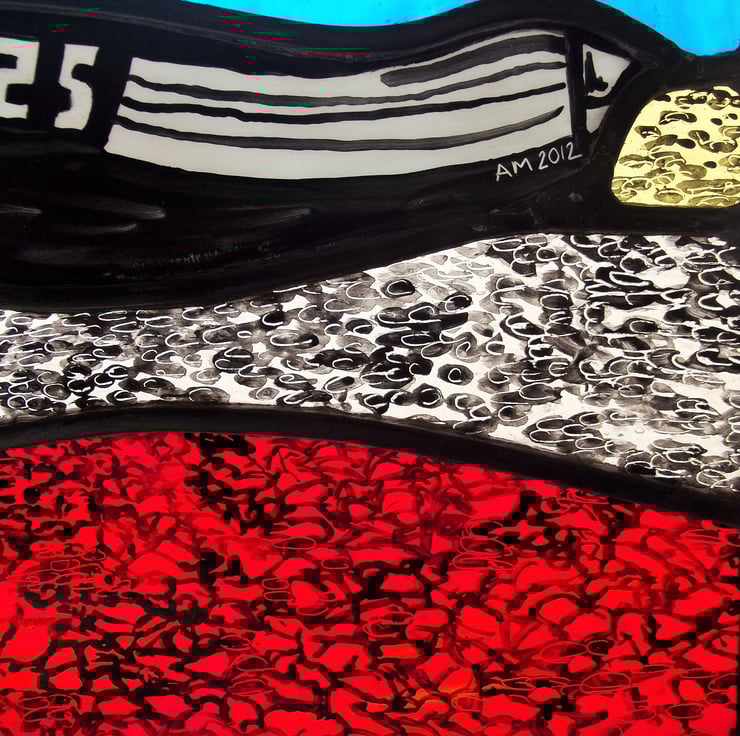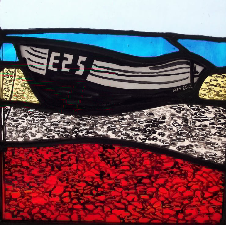 Much of my work is inspired by the local landscape in Devon, especially the coastline. I take many photos whilst strolling on the beach and in this case I worked this into a drawing and then a stained glass design.