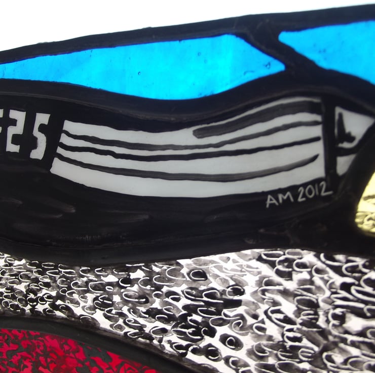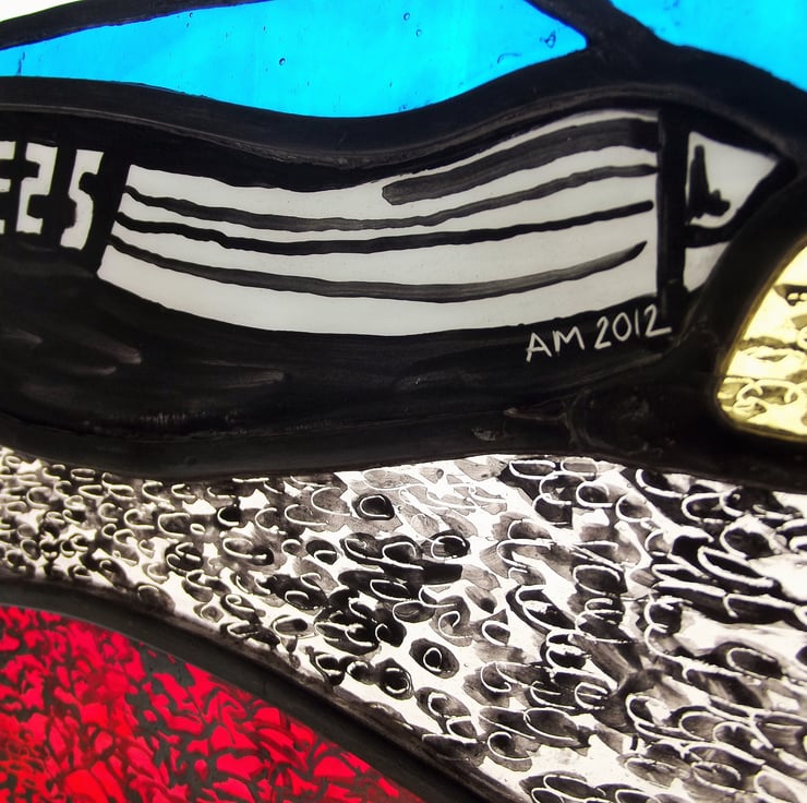 Made for a Devon Gallery which has sadly closed down I now have my lovely original, signed piece back to hang in the shop. This finely crafted stained glass panel is painted with traditional kiln fired glass enamels and the strong colours give the traditional craft a modern twist.