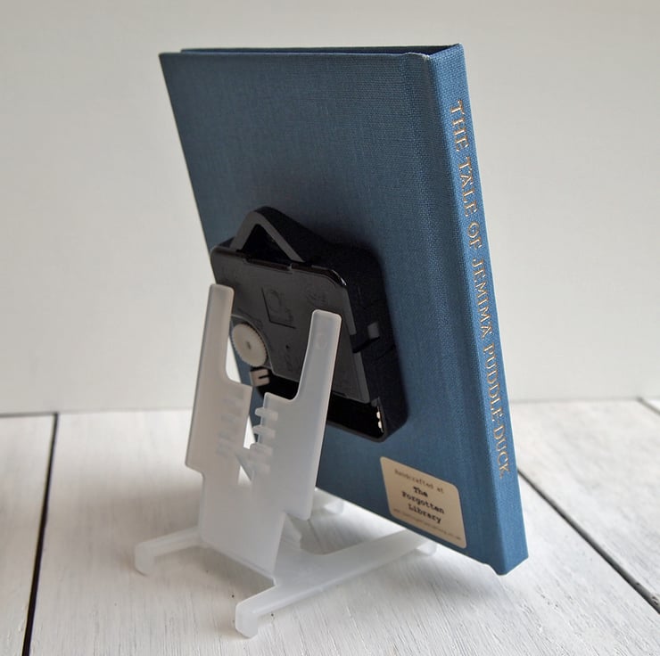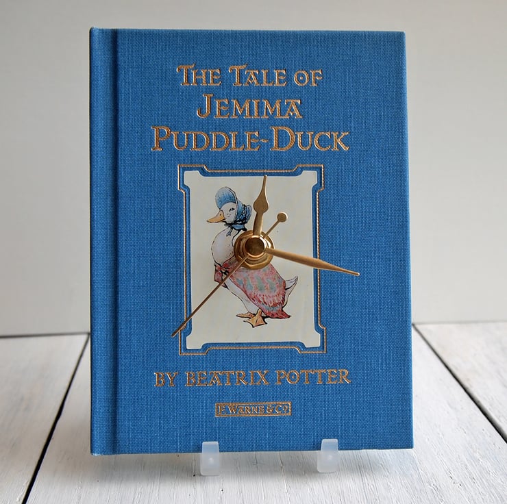 This clock has been created from an original copy of the book The Tale of Jemima Puddle-Duck The book has been read and enjoyed by a previous owner so it may show light wear to the cover. This edition is a beautiful clothbound book with gold block titles. The blue is a delicate pale blue most accurately shown in the photograph of the back of the clock.