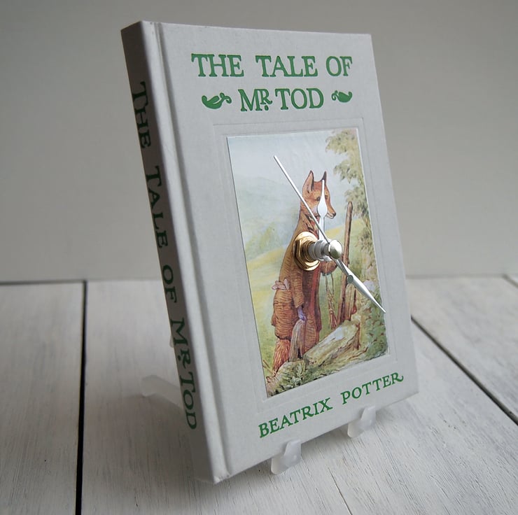 This clock has been created from an original copy of the book The Tale of Mr. Tod by Beatrix Potter. The book has been read and enjoyed by a previous owner so it may show light wear to the cover. This edition was produced from the 1940s to 1970s.