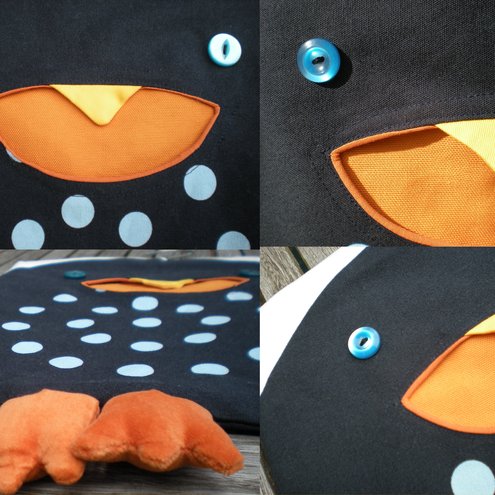 Made from new Ikea fabric (a very heavy cotton), with cotton velvet feet, and Gran’s button box buttons...