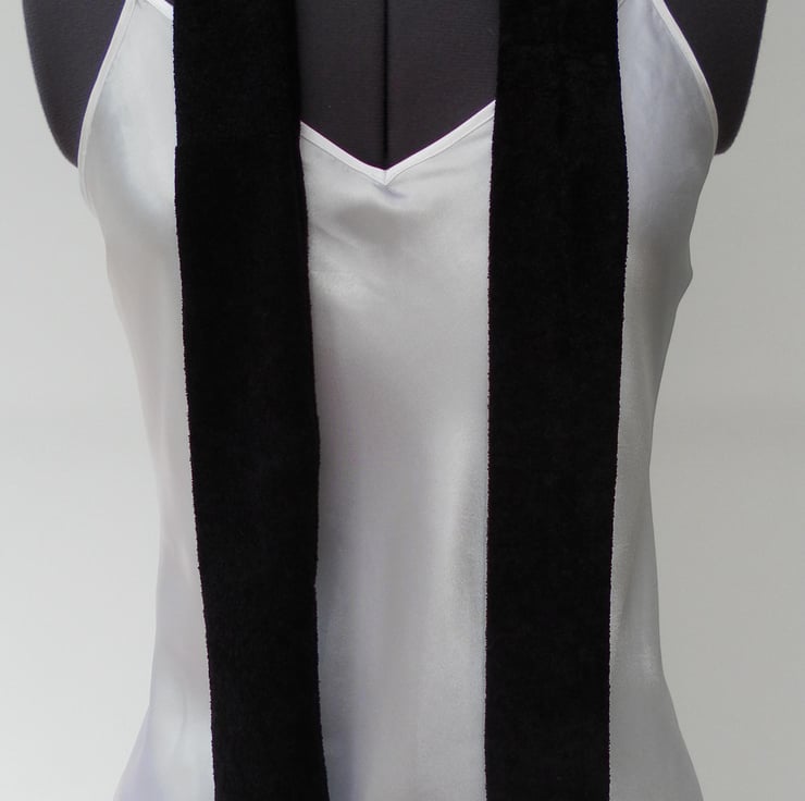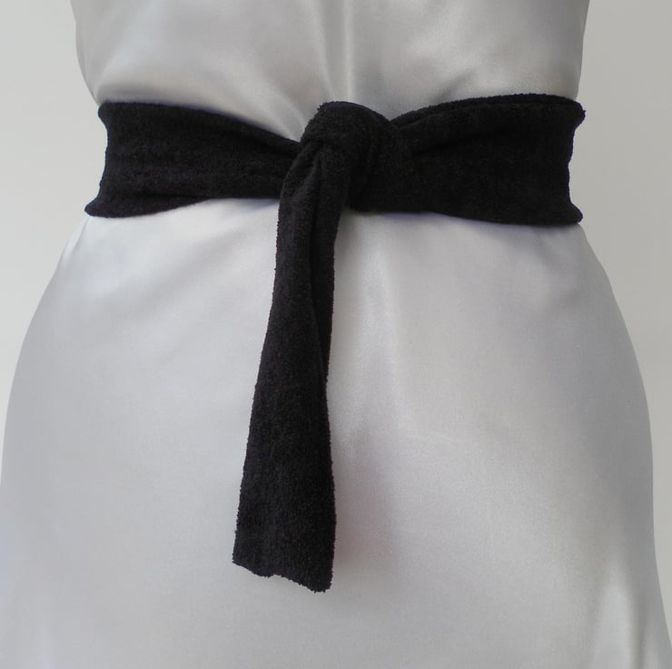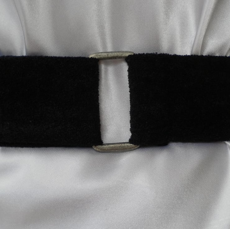 This fabric belt is a one off and would be unique to you! The fabric is black, textured and slightly stretchy. The buckle is a rectangle of distressed, silver tone metal. The belt is approximately 134cm x 5cm and is fastened by tying, at the front, side or back.