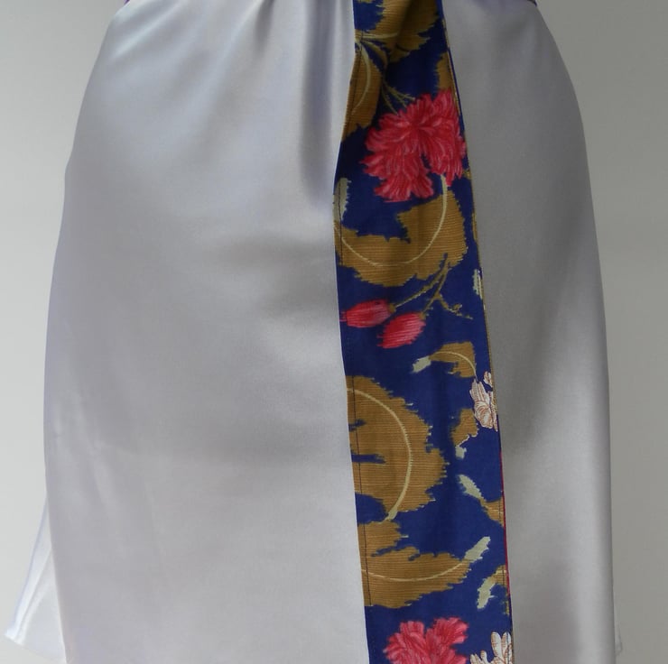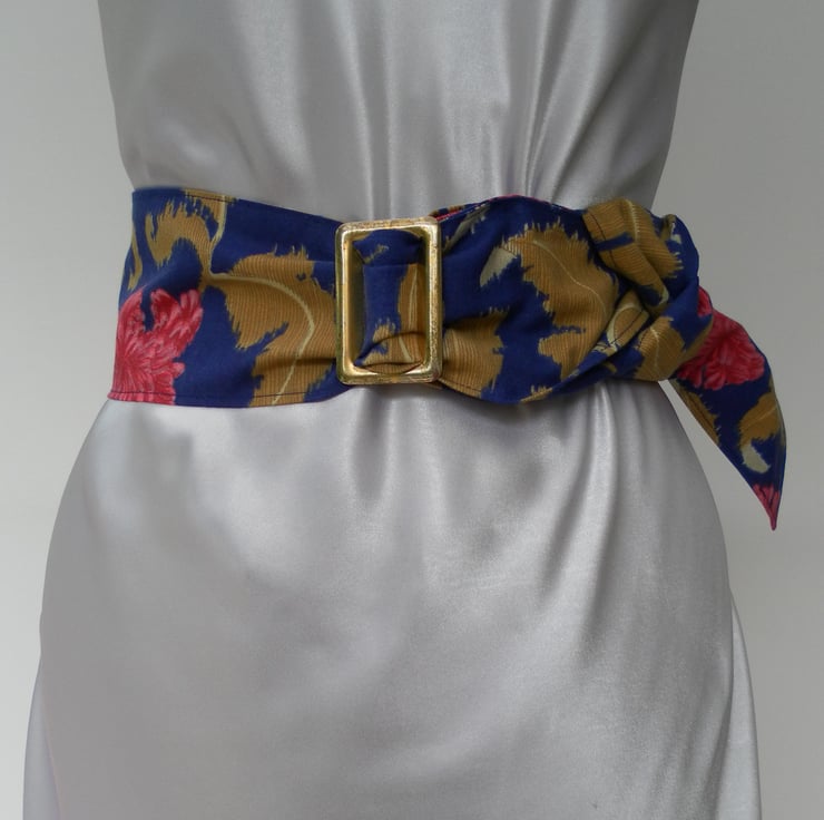 This fabric belt is a one off and would be unique to you! It is made from a strong, floral cotton fabric with a mid blue background, gold foliage, and white and dark pink flowers. The buckle is a rectangle of distressed, gold tone metal. The belt is approximately 130cm x 8.5cm and is fastened with the buckle and the tail can be left to hang or tied at the side. The belt matches a bag in my shop.