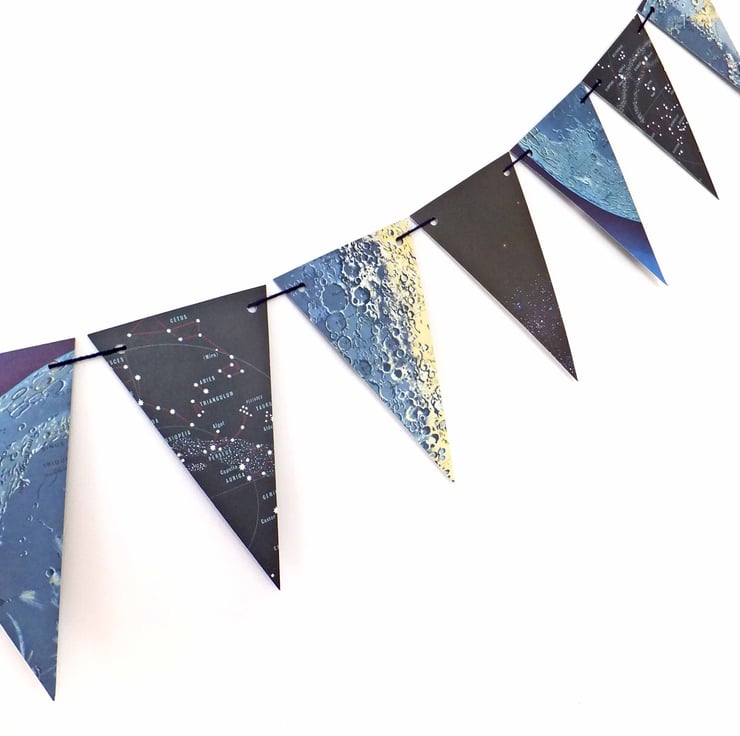 " This Moon and Stars Bunting is wonderful. Each triangle has stars or moon, and they all hang from deep blue yarn, adjustable to whatever span I need to decorate. They arrived in perfect condition, super-fast. I am delighted."