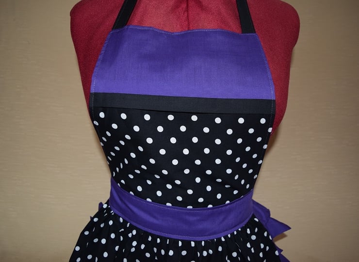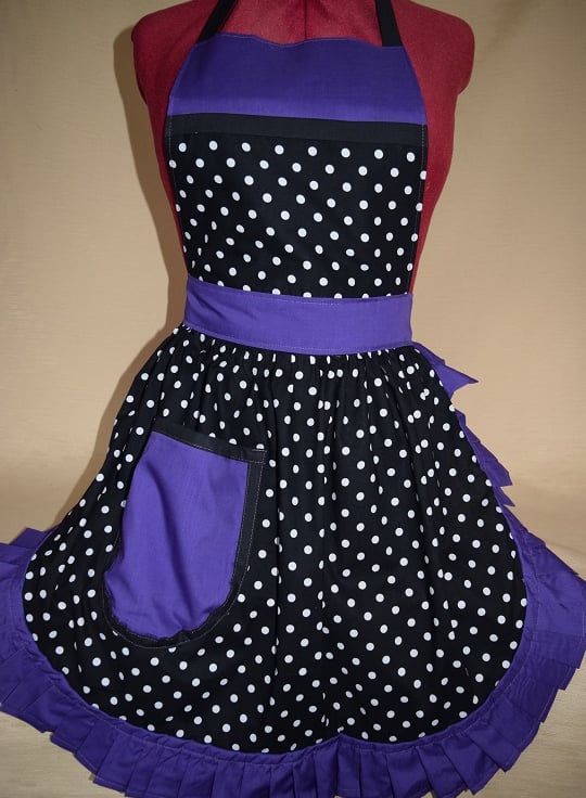 Here we have a lovely cotton rich black and white polka dot with purple trim retro style apron, handmade in house to our own design. (see photos). Adjustable neck and waist ties so will fit up to a size 22.