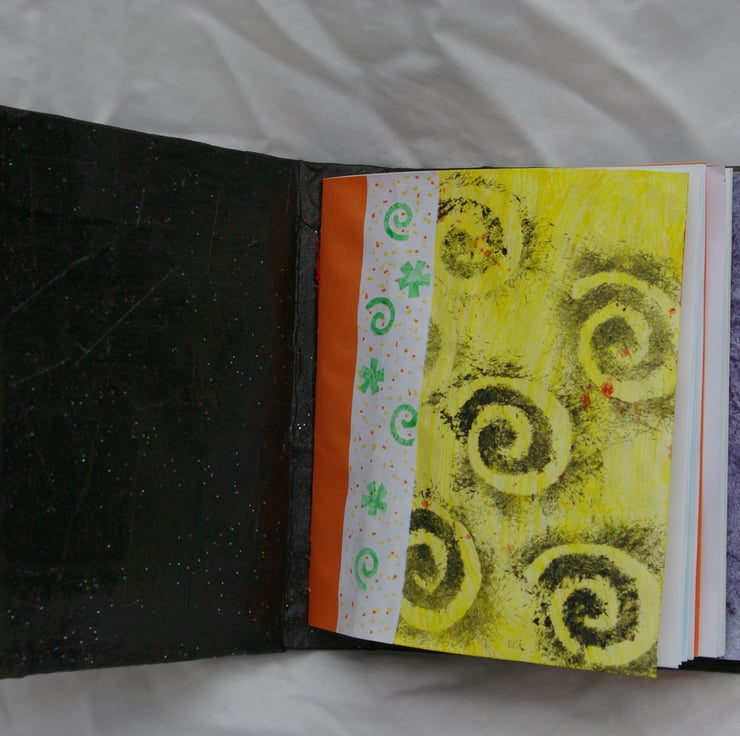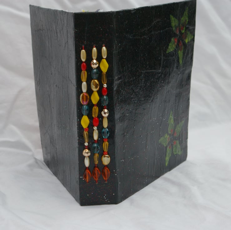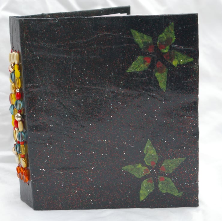 Hand painted hard back cover in a black paint which contains multi coloured shiny glitter to give that added sparkle. The front cover is also hand painted with two stylized flowers. I have also upcylced some broken jewellery pieces to bead the spine. I have used a selection of red, yellow and green beads some are plastic while others are glass.