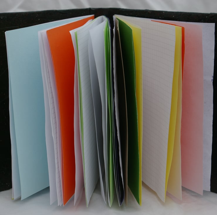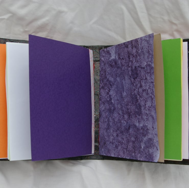 A hard back paper mache small journal or large notebook. As with this series of journal/notebooks this one has also been created from a mix of upcycled and new materials.