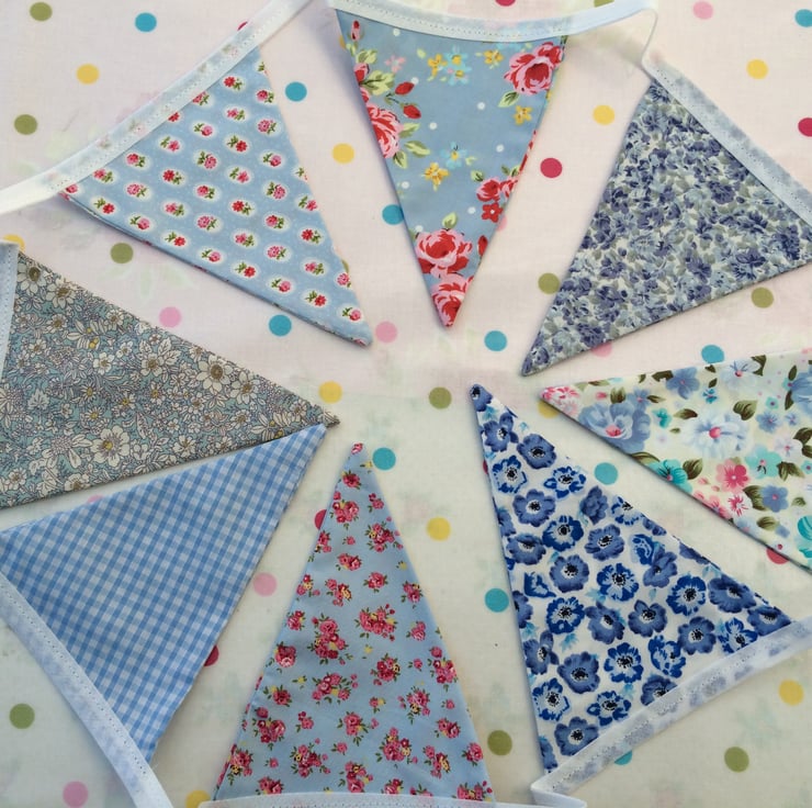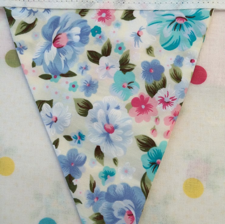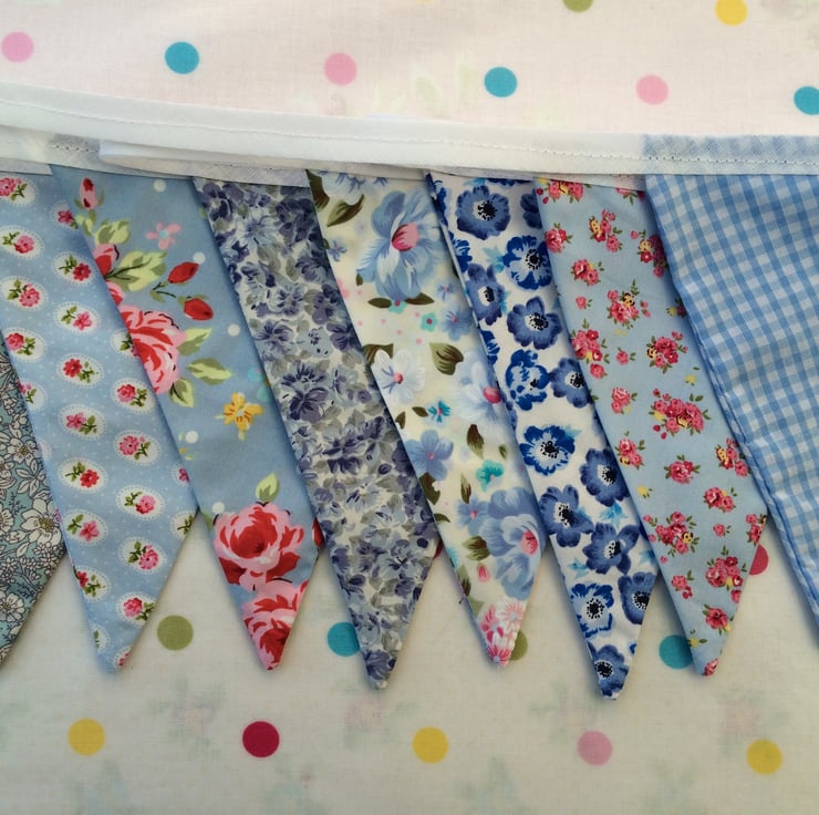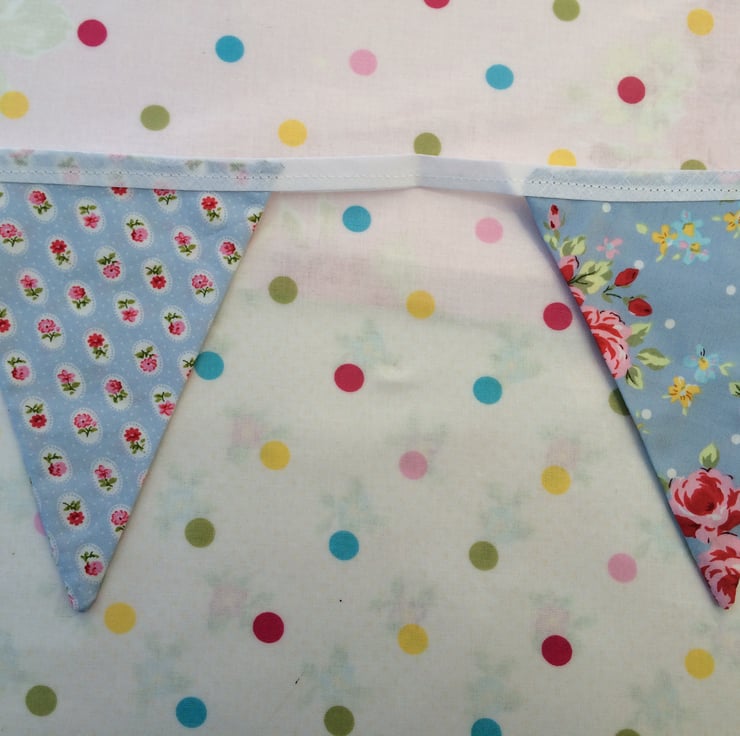 10 ft gorgeous bunting , each flag is nearly 7" tall , double sided,made with cotton fabrics then finished off with white bias binding,other colours available