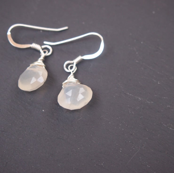 Beautiful "briolette"-cut moonstones in a translucent creamy-white, facetted so they catch the light, set on sterling-silver ear wires.