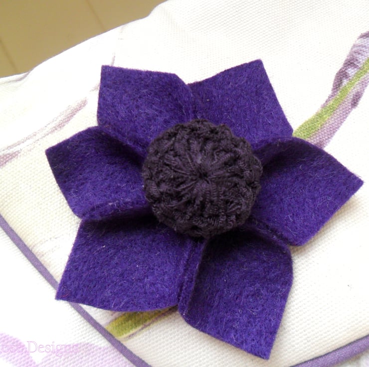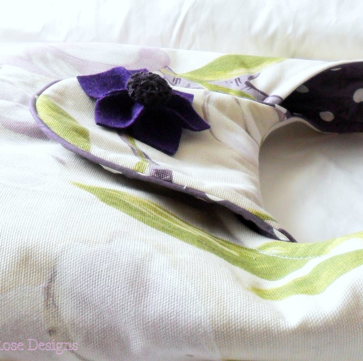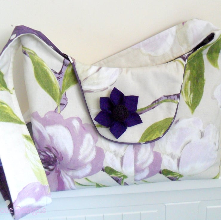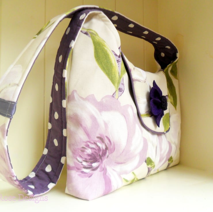Made in a lovely purple, lilac and cream floral print cotton, this handmade hobo bag is the perfect bag for Summer! Lined in a purple and white spot cotton, it has two internal pockets, one of them a zipped pocket. The flap fasten with a magnetic snap and is decorated with a handmade felt flower brooch.The metre long strap handle will fit over your shoulder and is long enough to wear across the body.