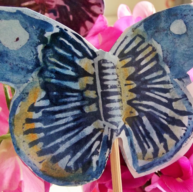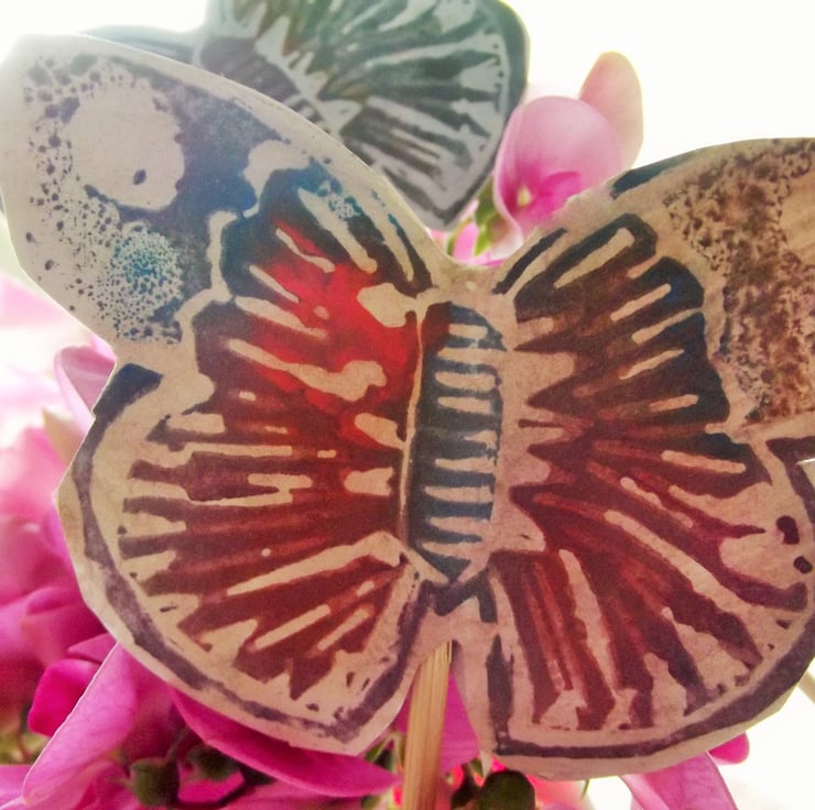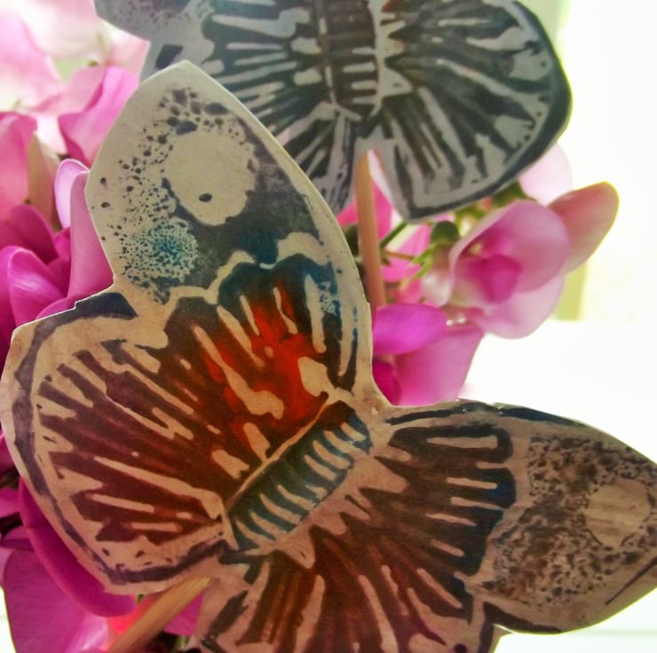 Each of these butterflies is hand printed with from my lino cut design and each is totally unique. The ink is mat and they come in a pretty rainbow of colours. These look fabulous amongst a bouquet of flowers or floral table decorations.
