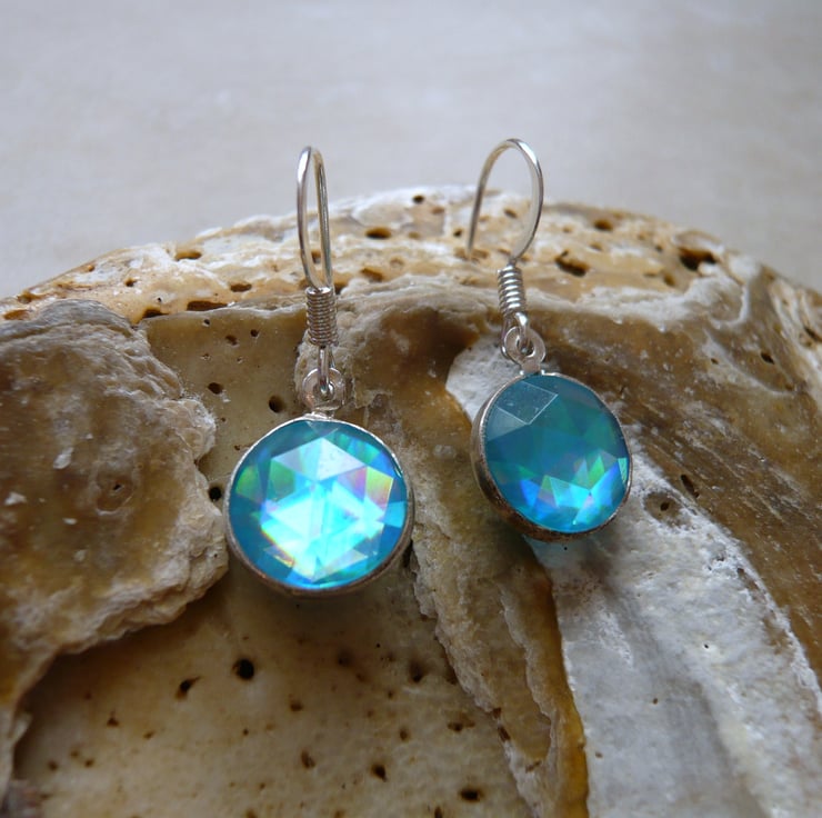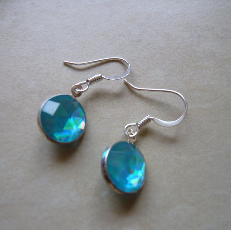 Hi, these aqua irridescent beads glint in the light so perfect to add a little sparkle to an outfit but simple for day wear aswell.