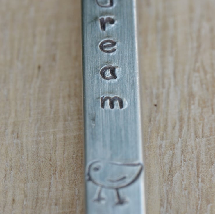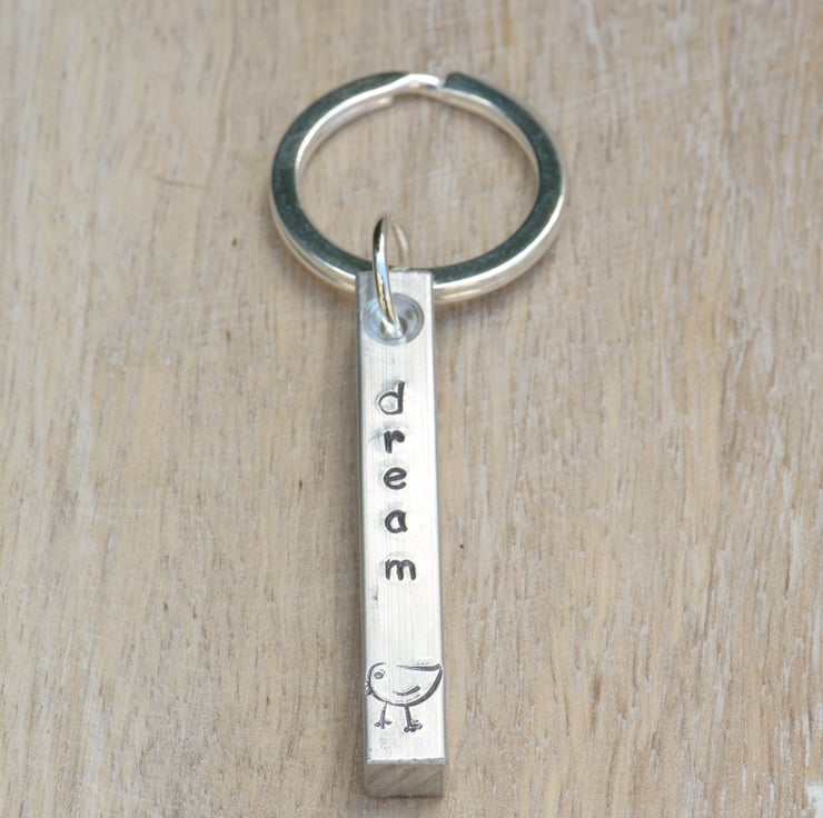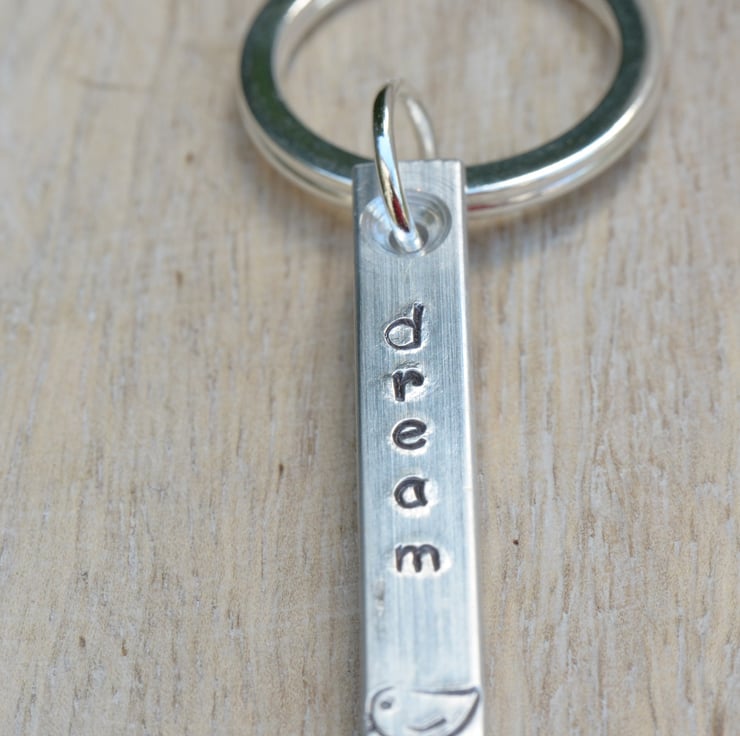 I have hand stamped an Aluminium Bar with the word "dream" and added a little bird stamp below and on the back. The bar has been attached to a strong silver plated jump ring and a large silver plated key ring.