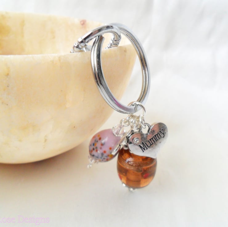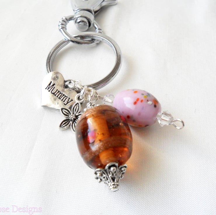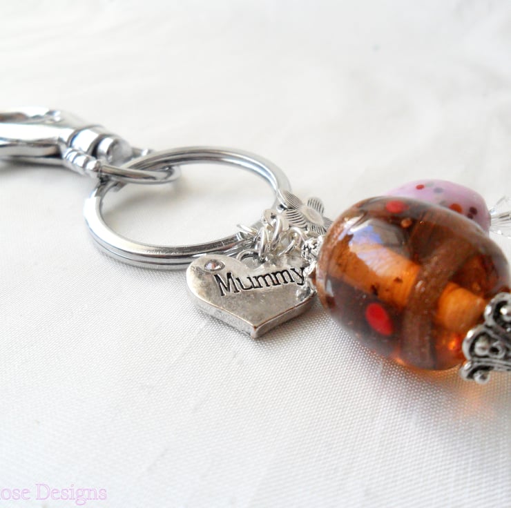 This handmade key ring has two large decorative beads in shades of pink and two silver coloured charms. One is a small flower and the other is a heart with the word 'Mummy' and a tiny diamante. The key ring measures 4 1/2" (11.5 cm) in length.