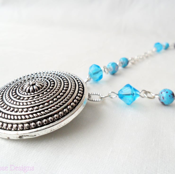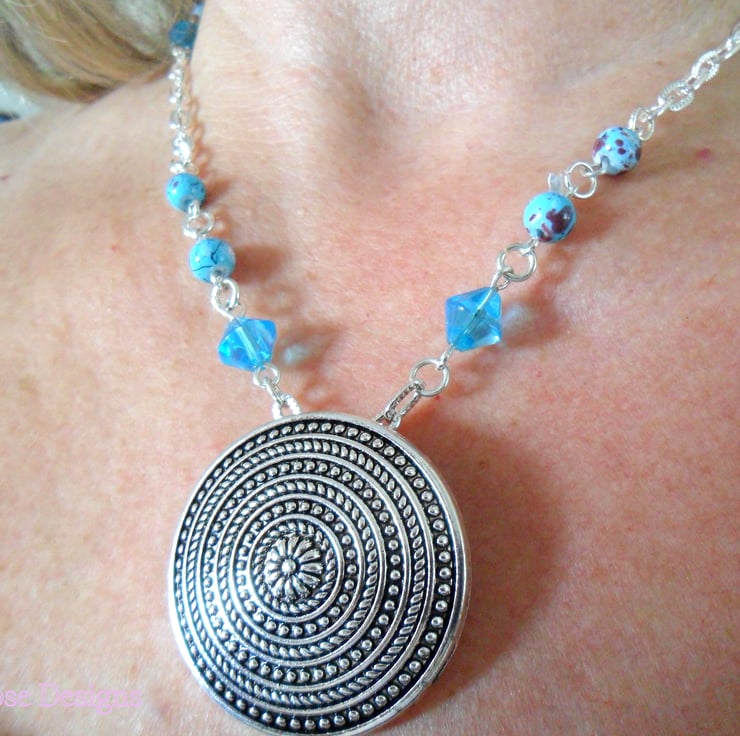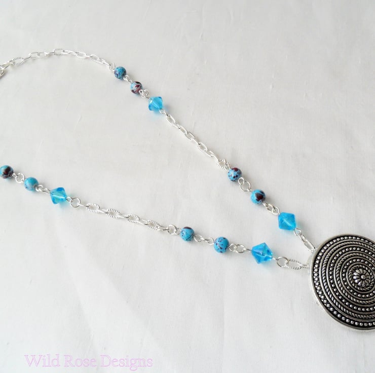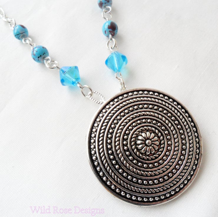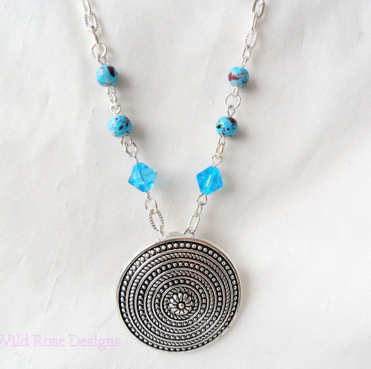 Lovely summery pendant necklace, handmade using 8 mm clear turquoise bicone beads and 6 mm round speckled turquoise beads set within a silver-plated patterned chain. The focal point of the necklace is a 4 cm round silver-plated pendant with a circular pattern. The necklace measures 18" long (46 cm) and fastens with a lobster claw clasp.