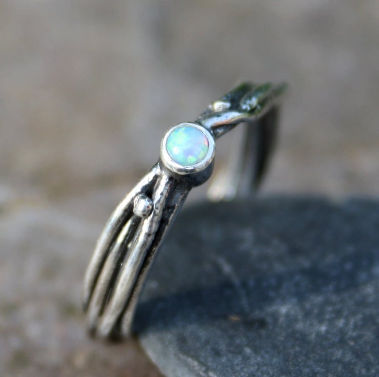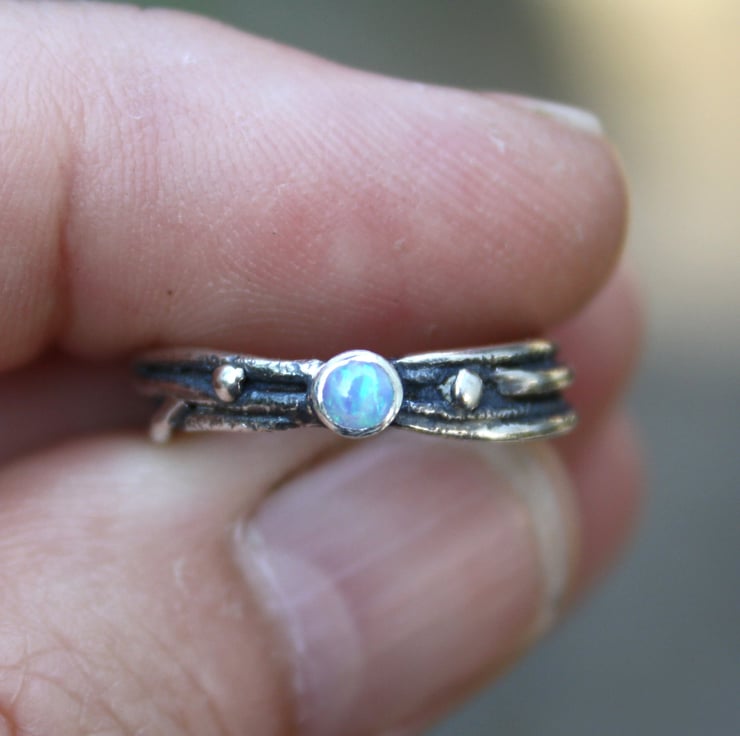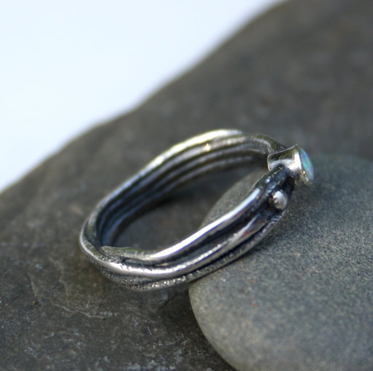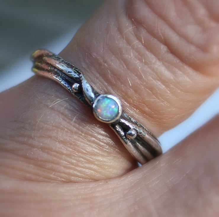 A delicate ,fine ring made from fused silver, set with a small colourful natural opal.