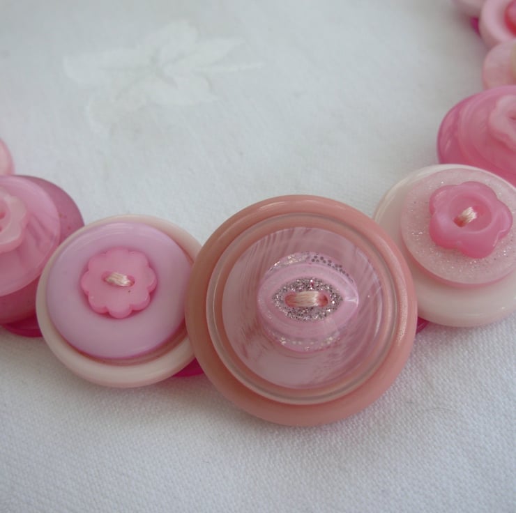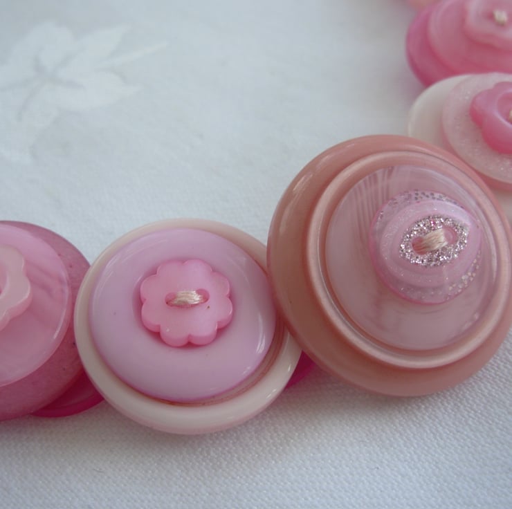 I've made this layered and stacked button necklace with assorted pink buttons. It's threaded and knotted with 6 strands of embroidery thread and finished with little clear AB beads and a toggle clasp
