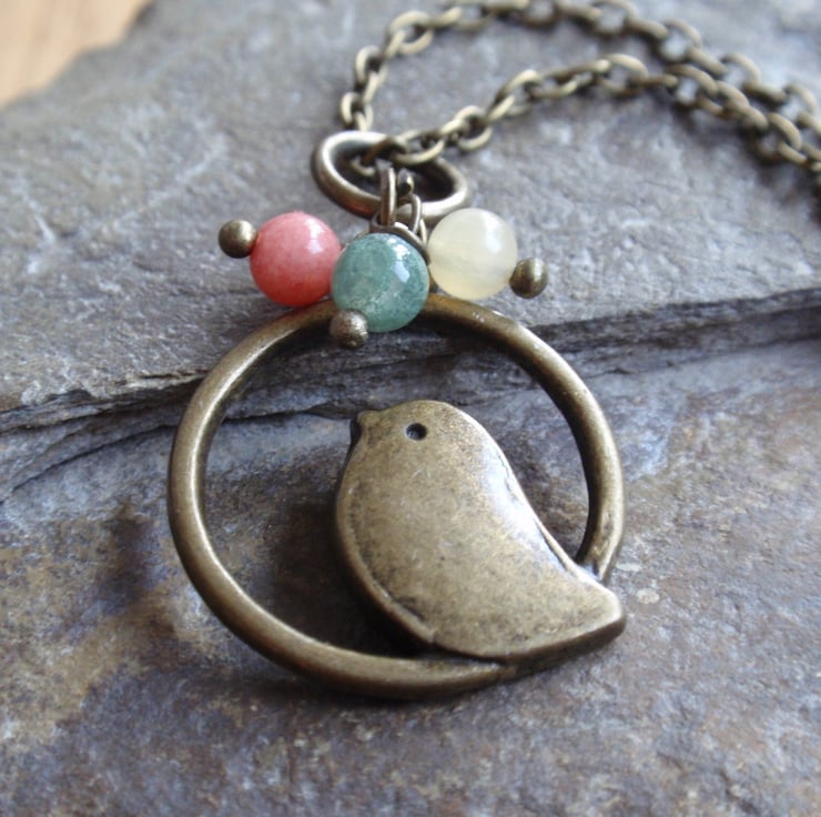 The gemstones include red mountain jade (coral tone), green aventurine and yellow aragonite.