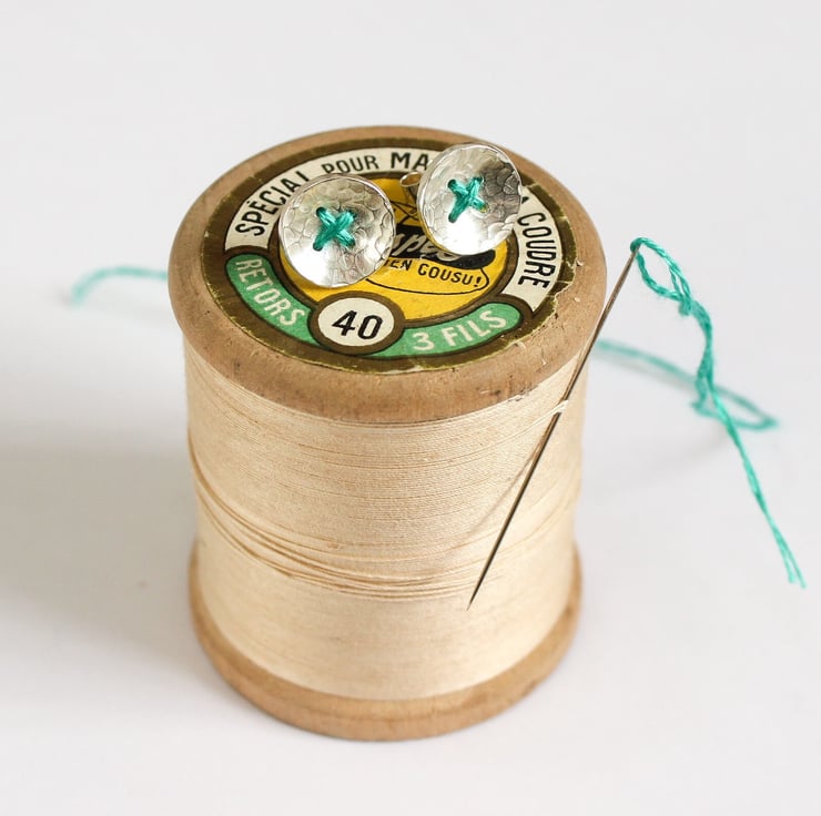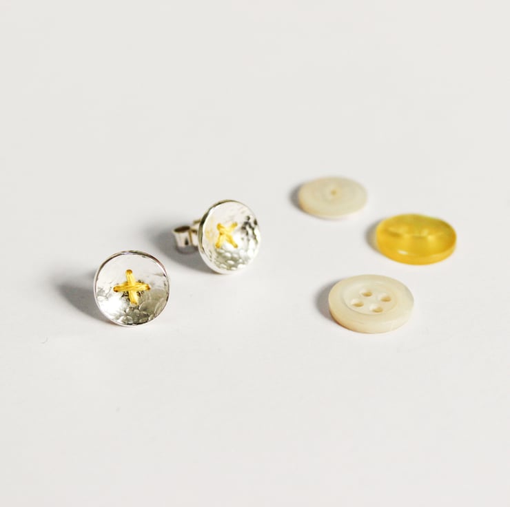 To make the buttons I've given the silver a hammered texture, domed it, and then drilled four holes to give the effect of a button. Sterling silver ear posts are securely soldered onto the back before finishing the earrings with a high polish.