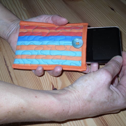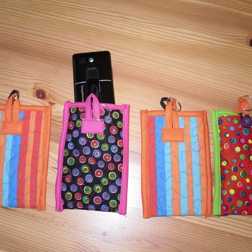 These phone covers are made from 100% cotton fabric, lined with cotton wadding for extra protection for your mobile device, and quilted in a random design. There is a button and elastic closure to keep your phone safe, and a hanging loop with a split ring on the back of the cover. These covers fit many different makes of mobile phones, MP3 players and other small mobile devices. The covers come in several different colour designs and patterns of fabric. The sizes also vary slightly. Most are 2.5" x 4.75". Some are slightly larger and fit ipods. Please state if you have a particular preference for size (i.e. require one of the larger covers) or colour, otherwise I will allocate the covers on a lucky dip basis!