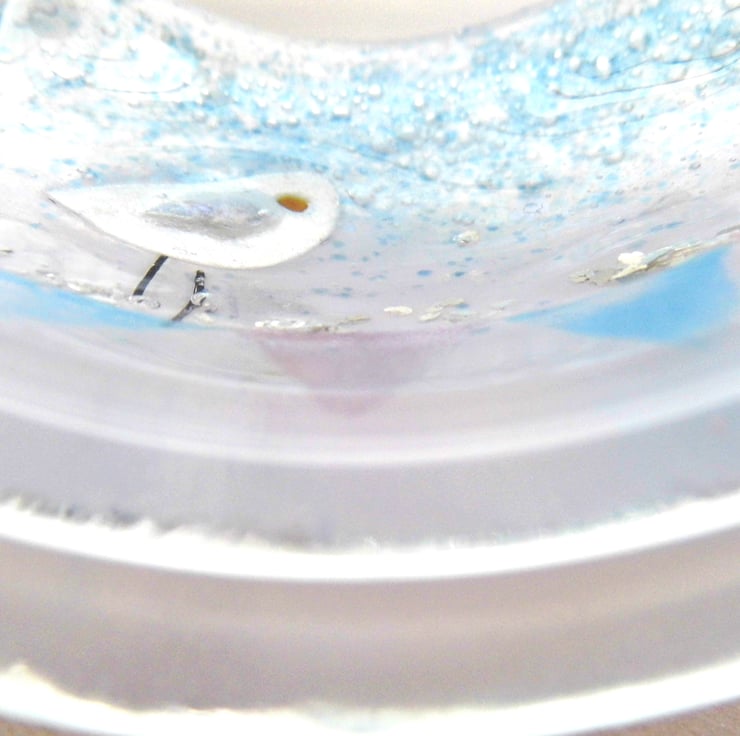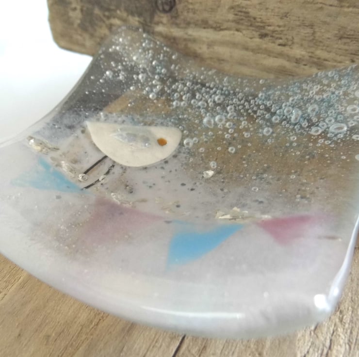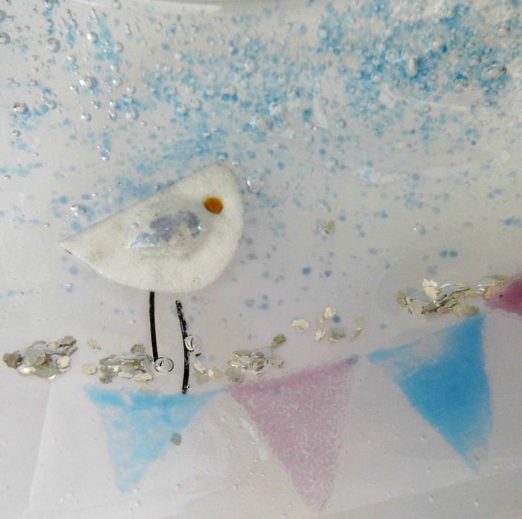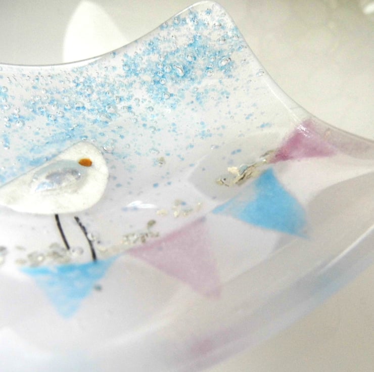 perfect for your bits and bobs this fused glass little birdy dish has a little bird with bunting and bubbles