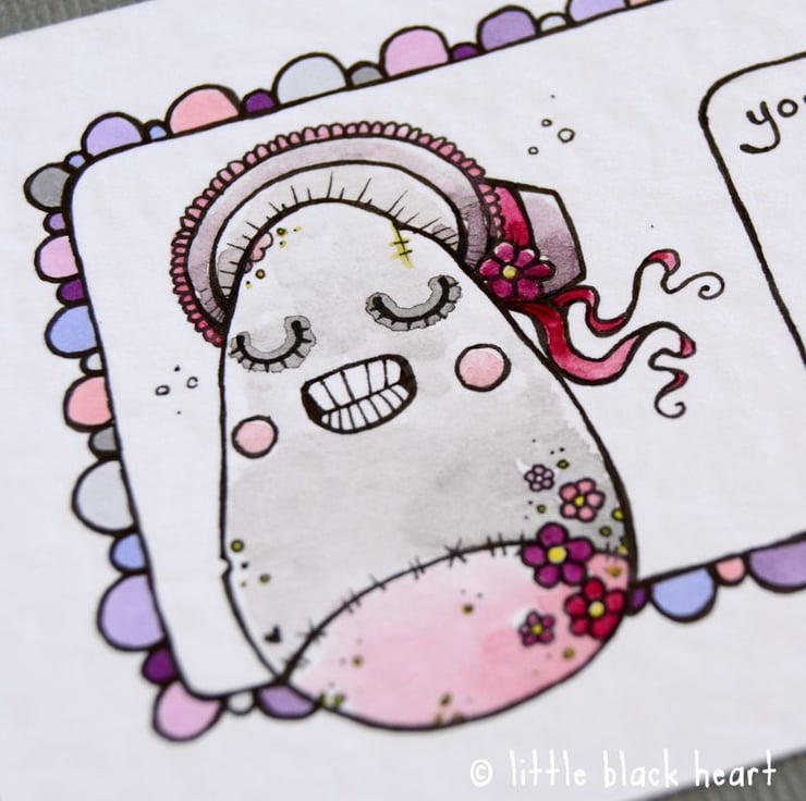 original artwork in artists pens and watercolour paints, on textured white 300gsm cardstock. drawn with a tiny 0.05 nibbed pen, and carefully painted with just the very tip of a tiny paintbrush! the patterned surround is coloured with art pens.