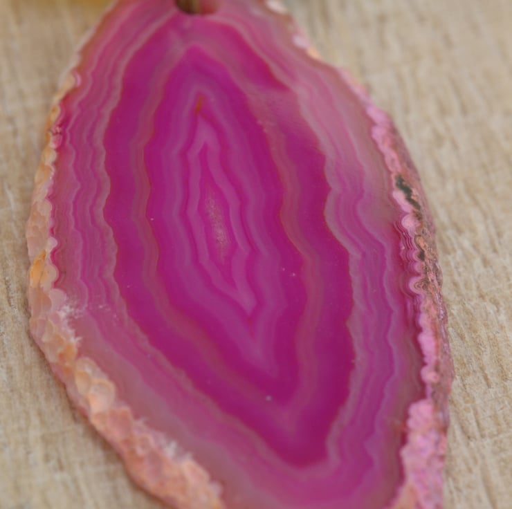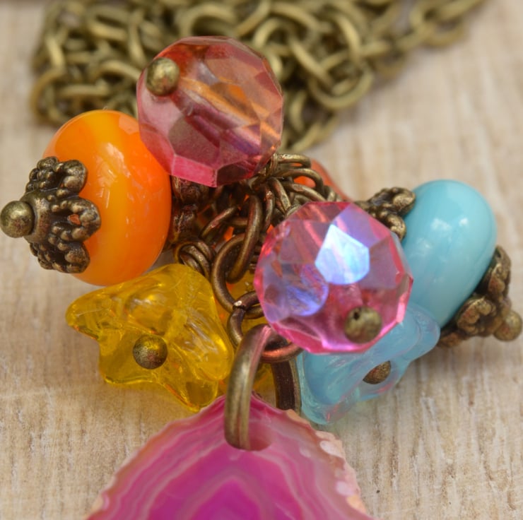 A lovely hot pink Agate slice pendant is the focal of this bright necklace. I have added a bouquet of summer brights in shades of pink, orange, yellow and turquoise which include lampwork glass rondelles, Czech faceted beads and flower cups. The necklace is finished on antique bronze plated chain with a trigger clasp.