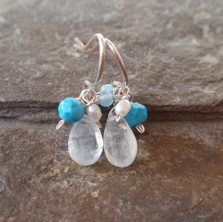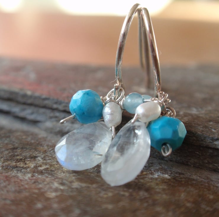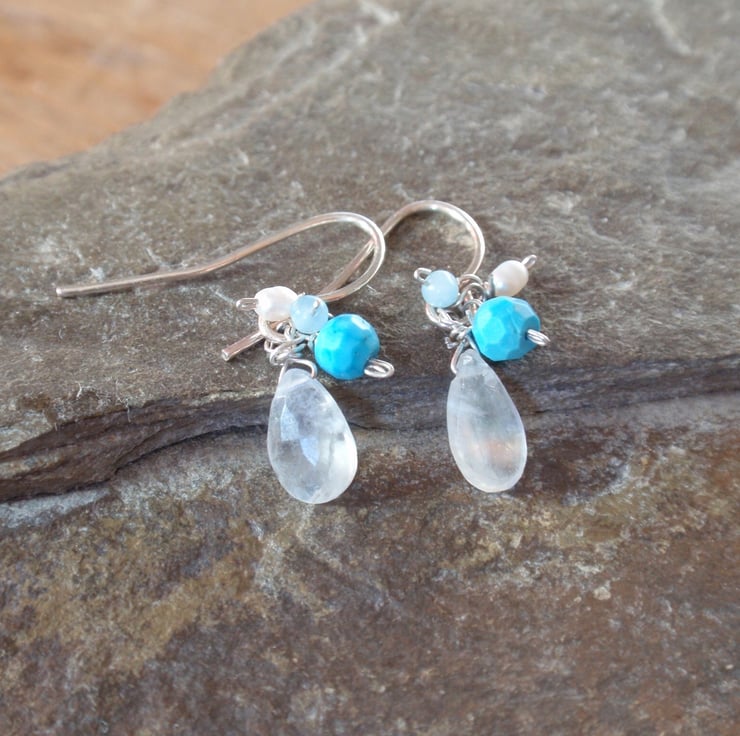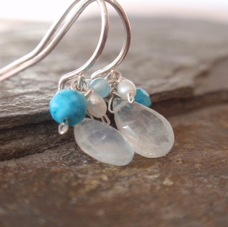 Pretty moonstone cluster earrings with turquoise, aquamarine and pearl.