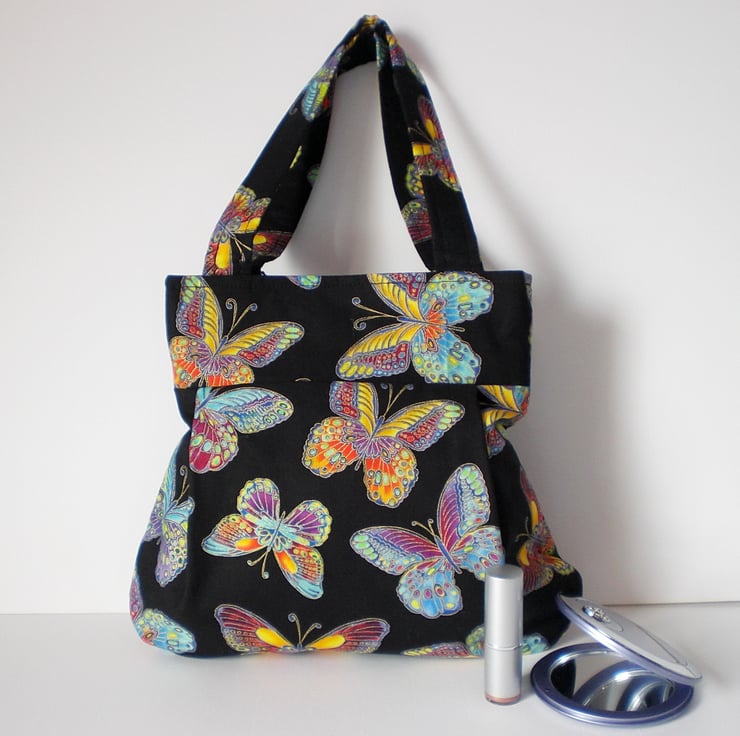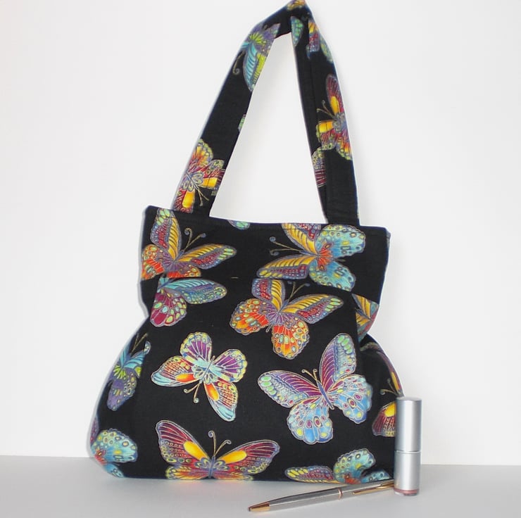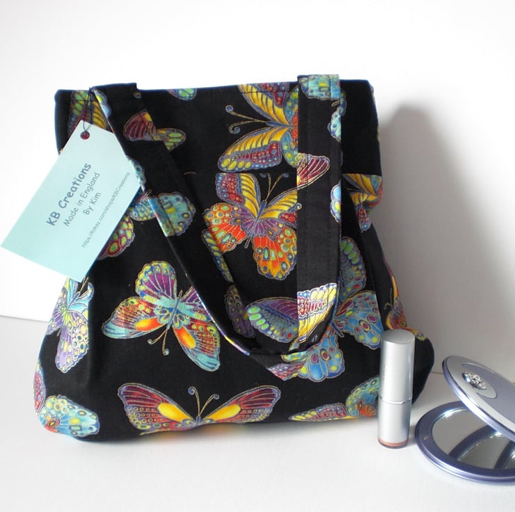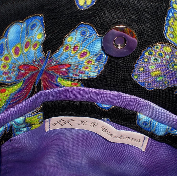 Black background and multi colour butterflies. Lilac lining with one slip pocket.