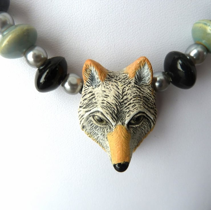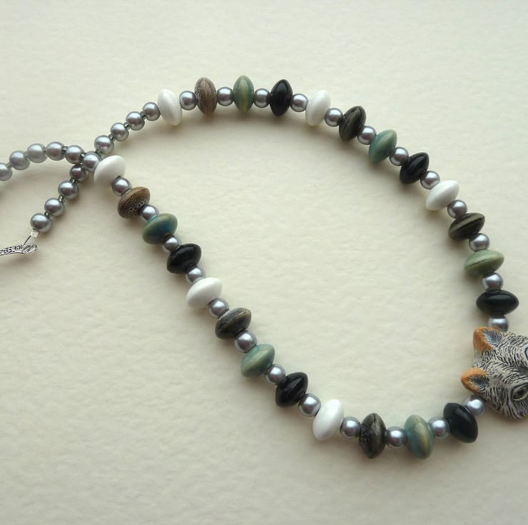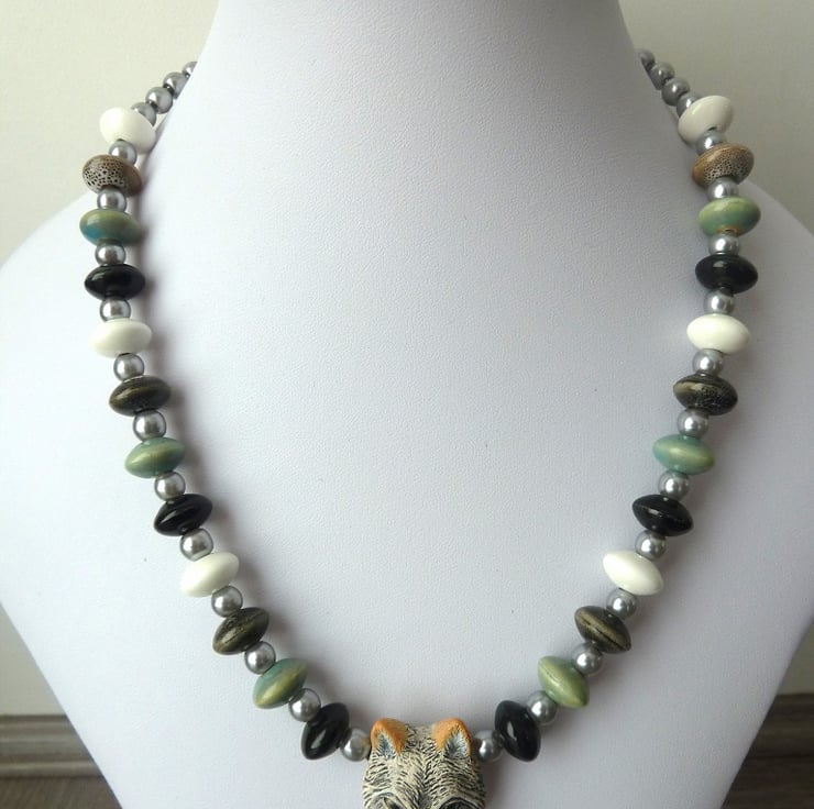 A necklace i have made with a hand painted Perivian wolf bead, grey glass pearls and ceramic disc beads.