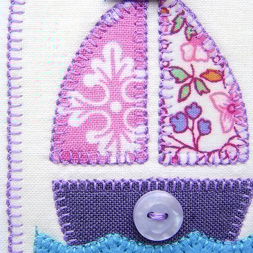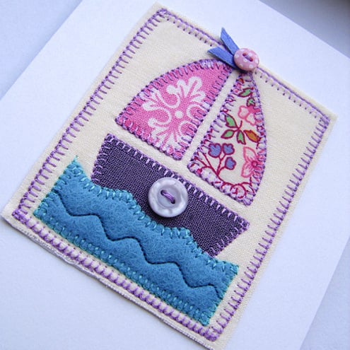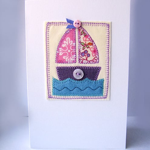 This is a lovely fabric greeting card featuring an appliqued boat design in shades of pink and lilac in coordinating fabrics. It is finished with button details and a little ribbon flag.