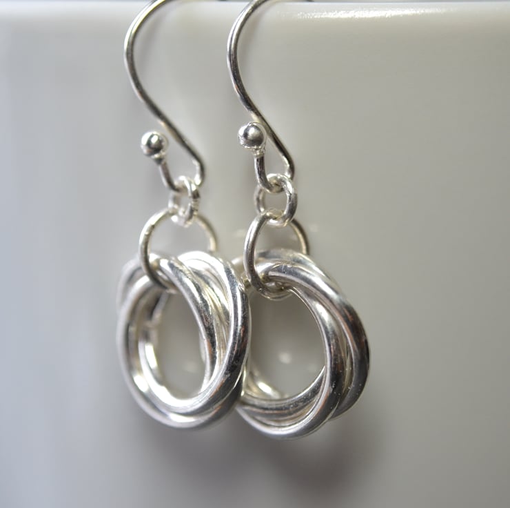 Three dainty sterling silver rings, interconnected in the traditional russian wedding ring style, hang from sterling silver earwires.