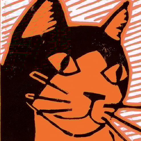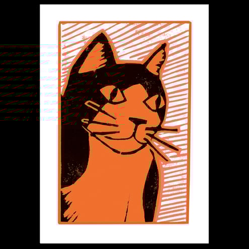 The poster is a professional digital print of an original linocut. The poster is printed on high quality off-white 170g Cyclus 100% recycled paper. From an edition of 30, hand-numbered, titled and signed.
