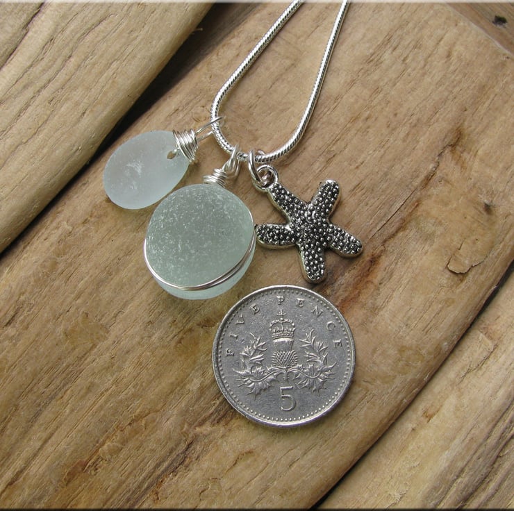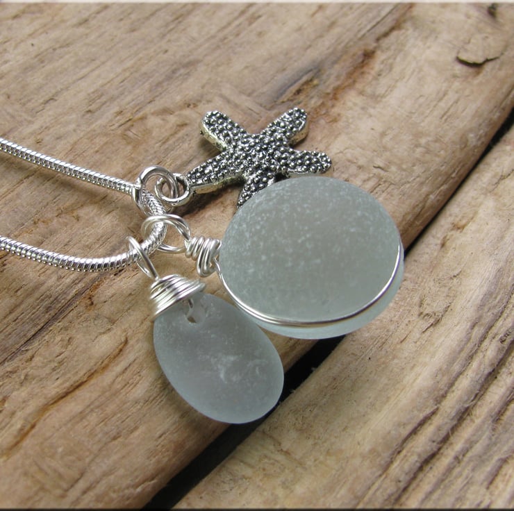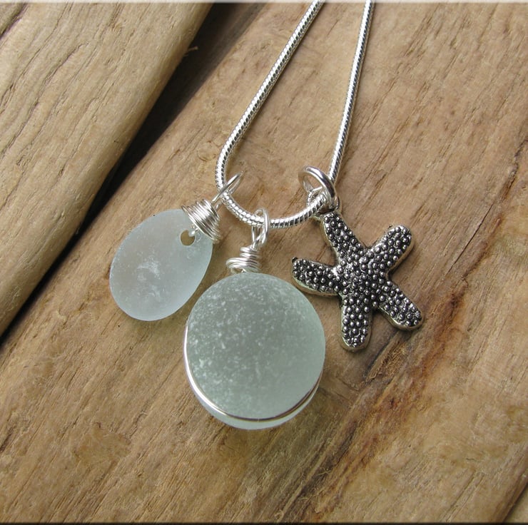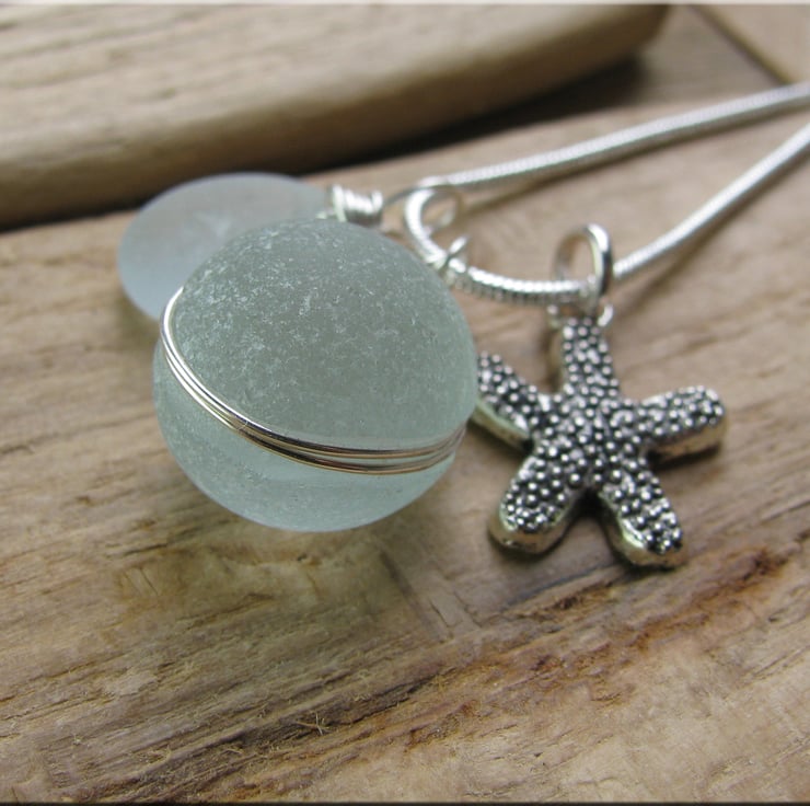 perfectly rounded and frosted seafoam coloured piece of sea glass set in wire. The glass has been carved out around the edge and the wire sits in the groove to hold the glass in place. The wire is non tarnish, and is suspended from a silvertone snake chain. Complimented by a seaglass drop and starfish charm. Approx. 18"