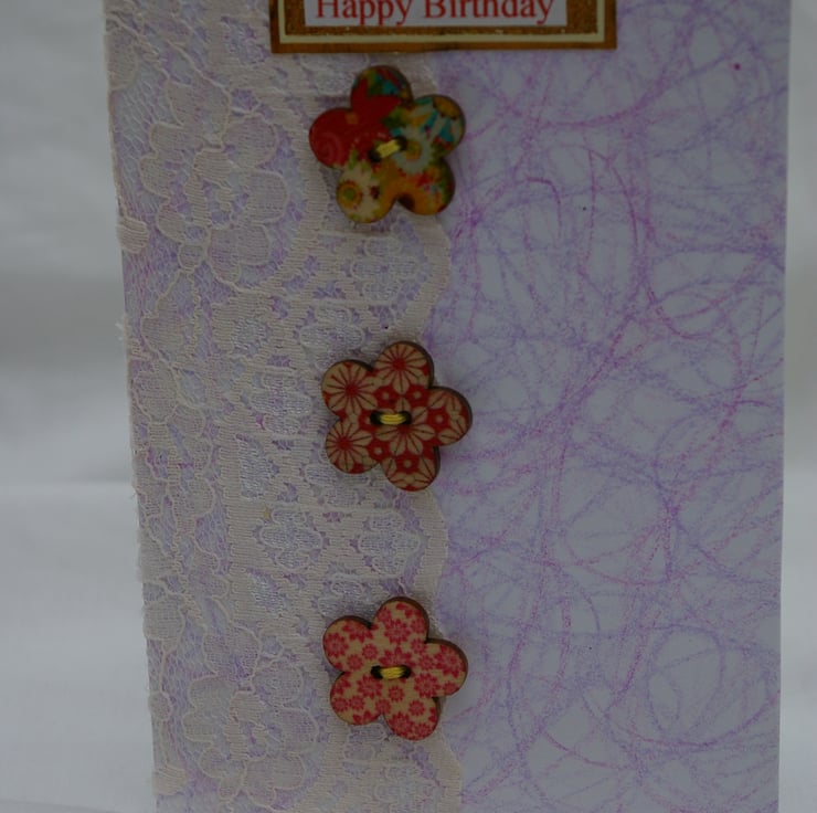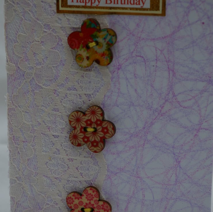 A pretty button and lace birthday card hand made with love. This card features three pretty flower shaped wooden buttons. Each button has a different design printed upon it. I have sewn the buttons on with pale yellow cotton thread onto a piece of white lace. This has then been mounted onto a hand sketched background of purple swirls. At the top of the Card printed in red are the words Happy Birthday which is mounted onto gold and cream colour card.