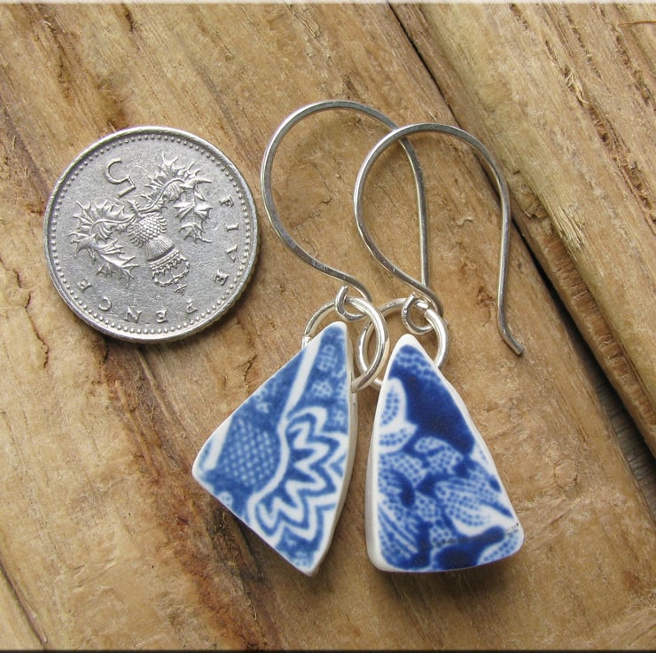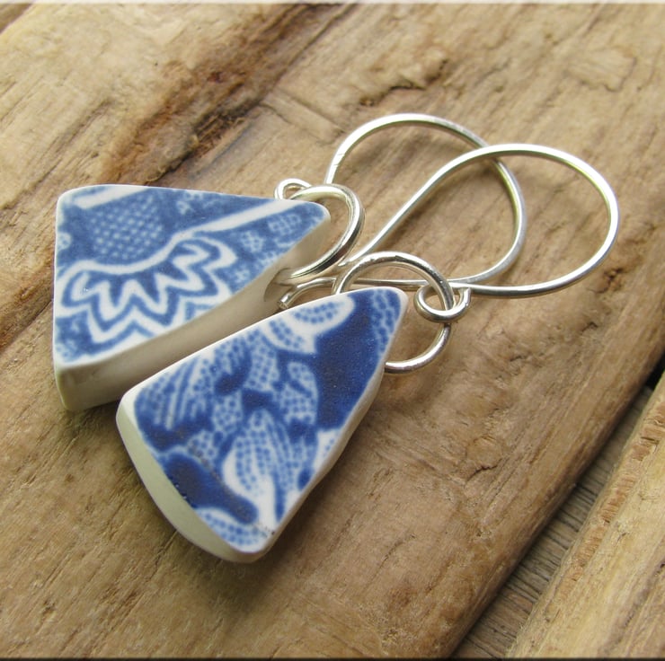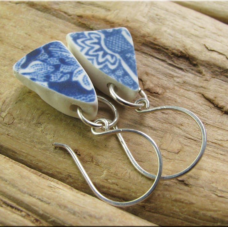 These earrings are made from 2 small pieces of blue and white pottery. Simply suspended on two large jump rings passing through the top. The earrings hooks are hand made from sterling silver wire and are 0.8mm thick.
