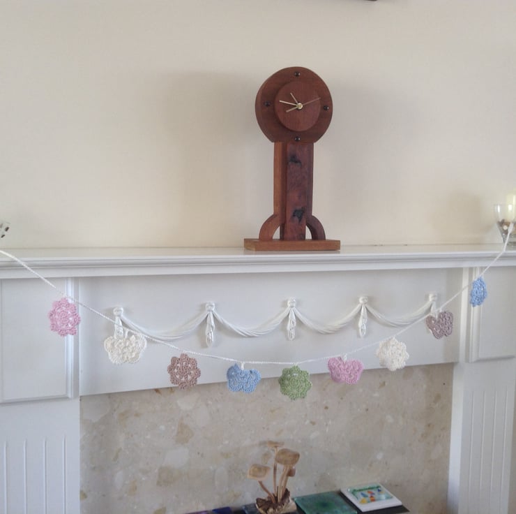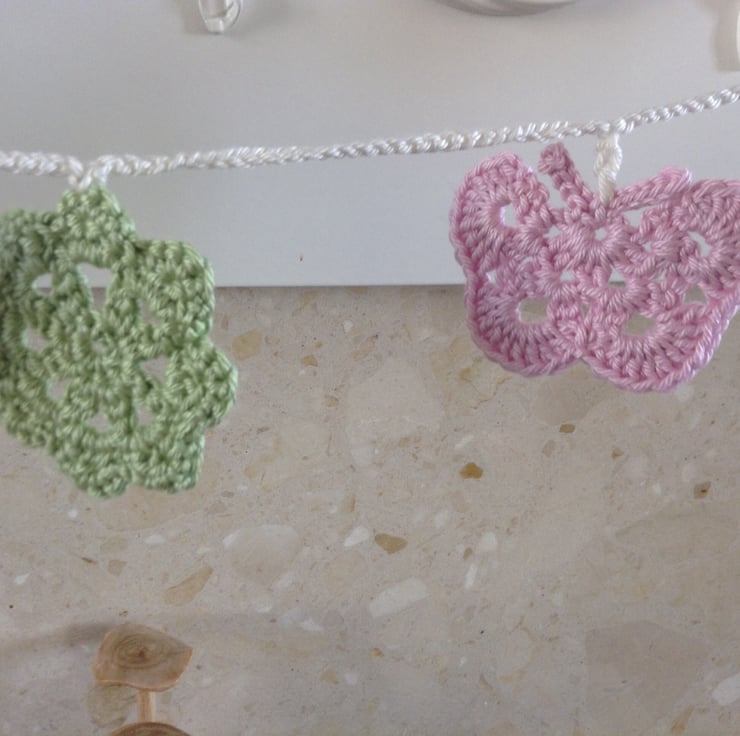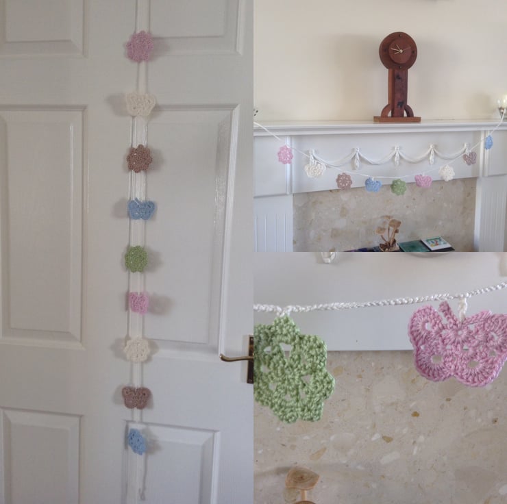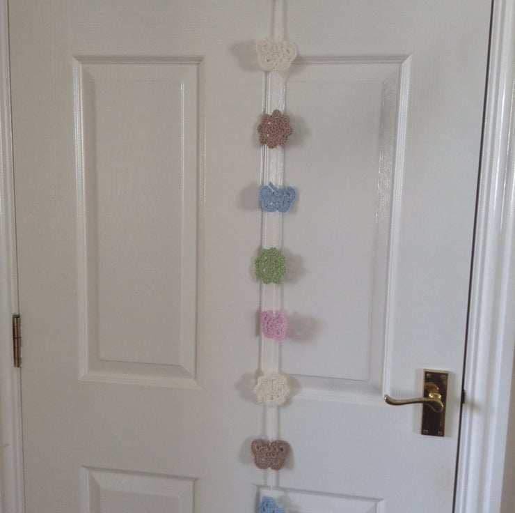 Crocheted in lovely pastel shades of coffee,cream,green,blue and pink these flowers and butterflies are hanging from a cream crocheted string with hanging loops.