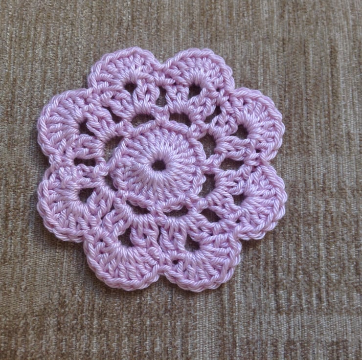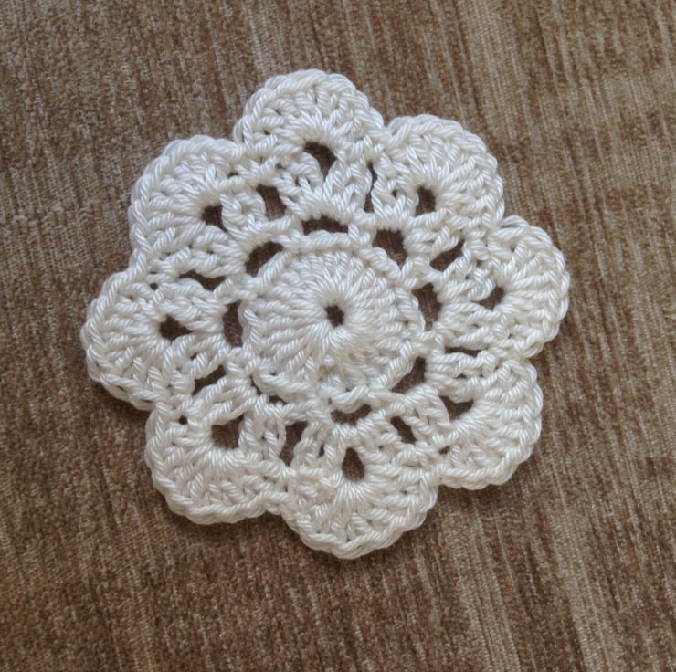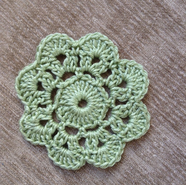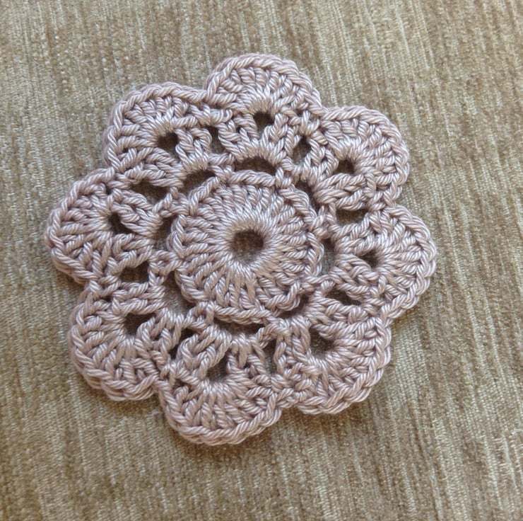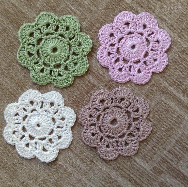 Set of 4 flower coasters crocheted in coffee,cream,pink and green.