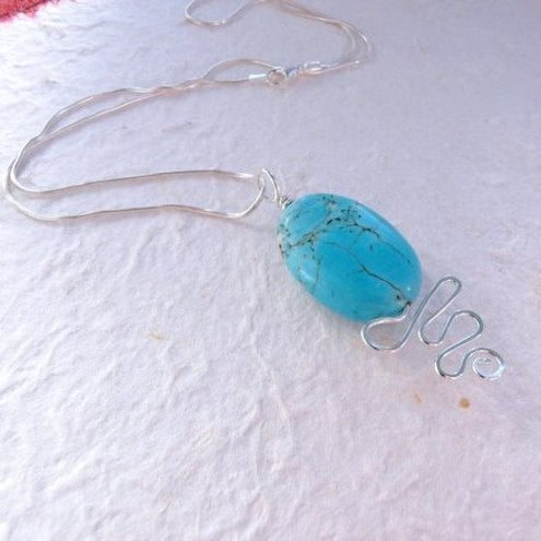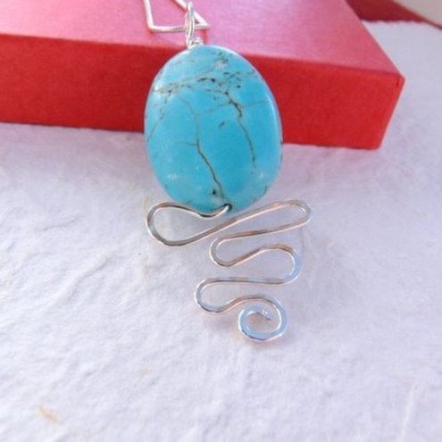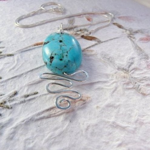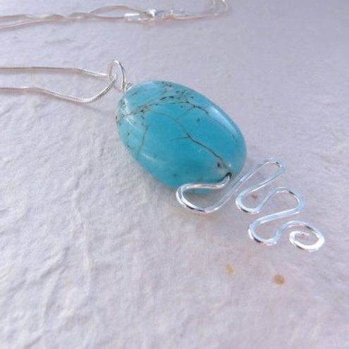 A gorgeous turquoise bead sits on curves of sterling silver. The pendant is hung on a sterling silver snake chain.