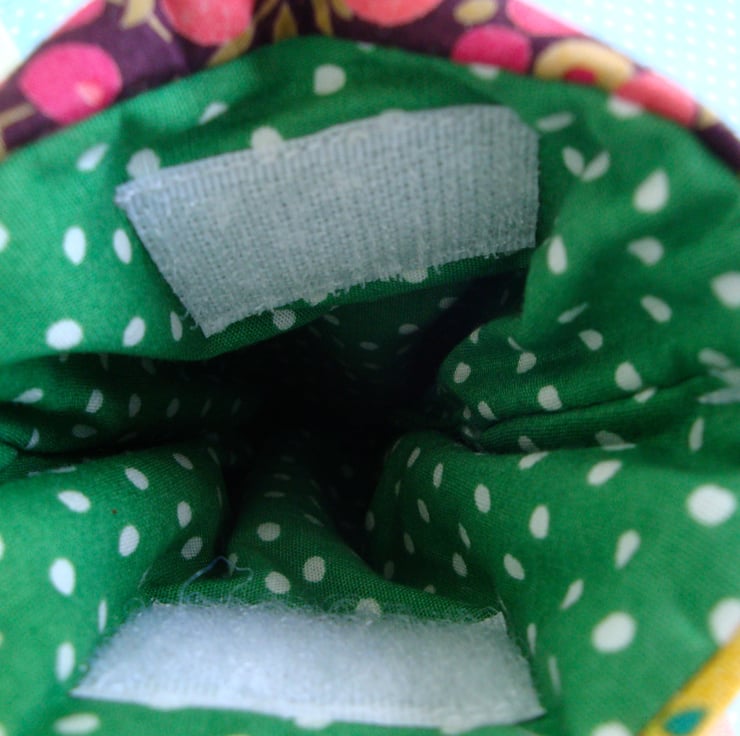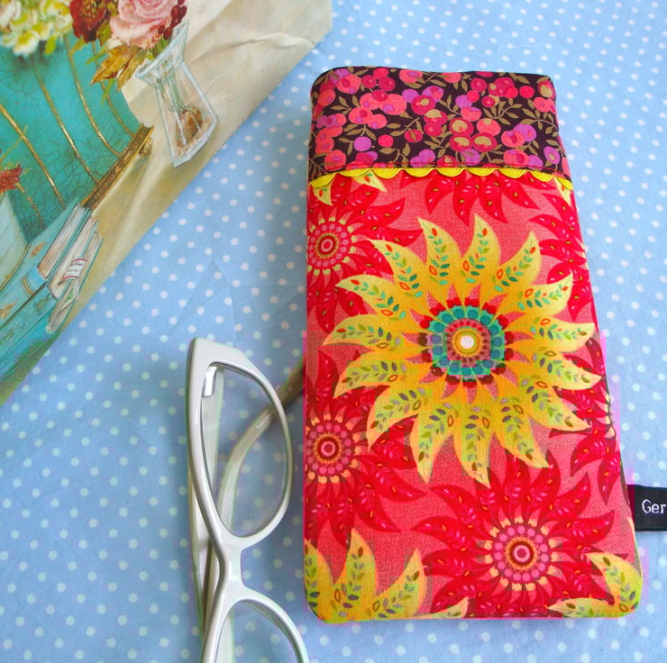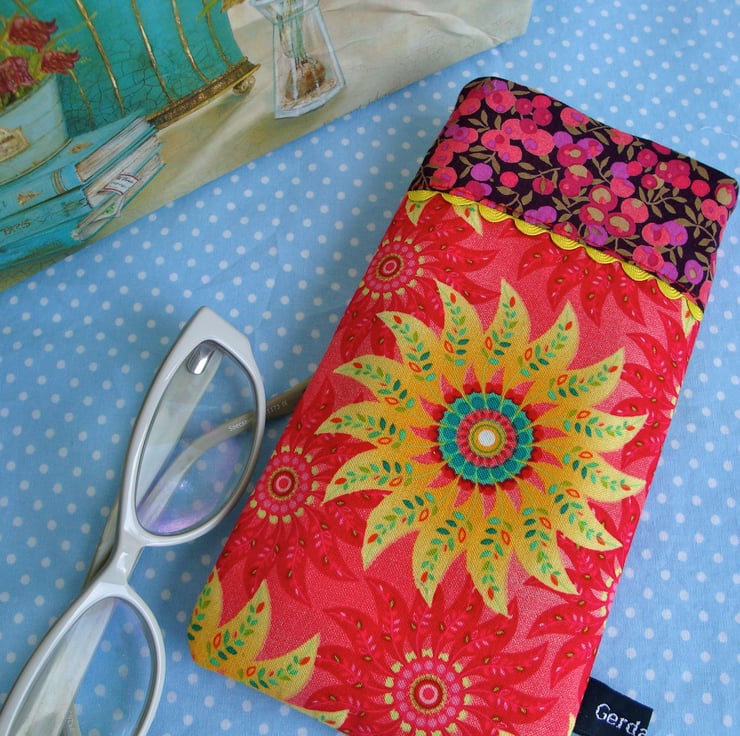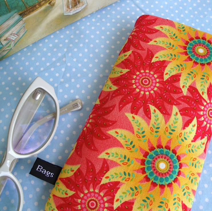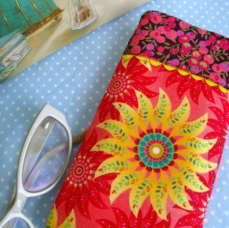 A lovely glasses case , ideal for any type of glasses . I used a printed sunflower cotton fabric for the back and lower front.